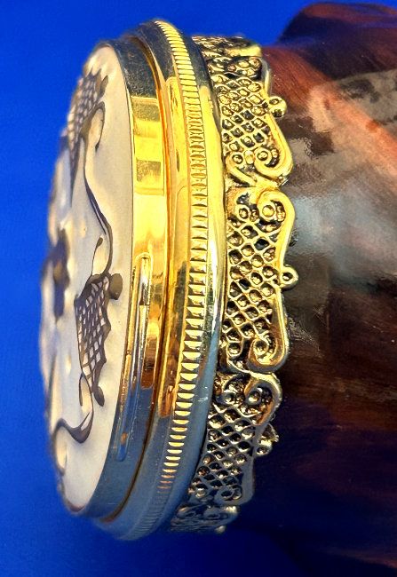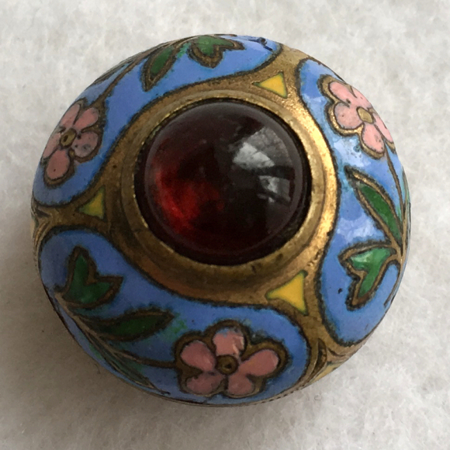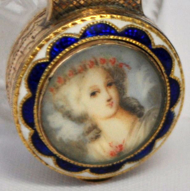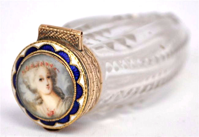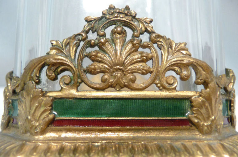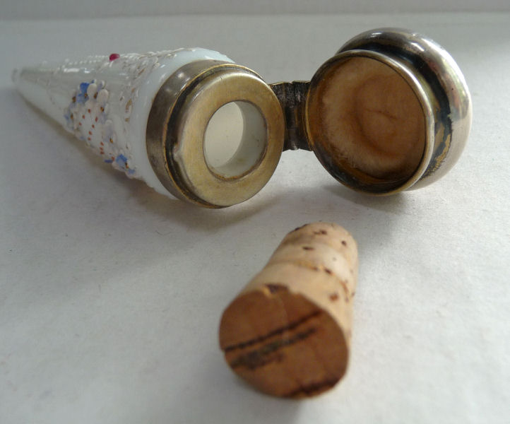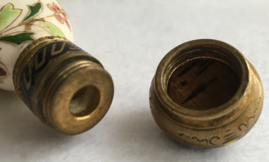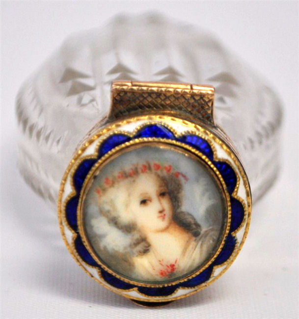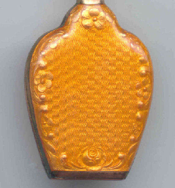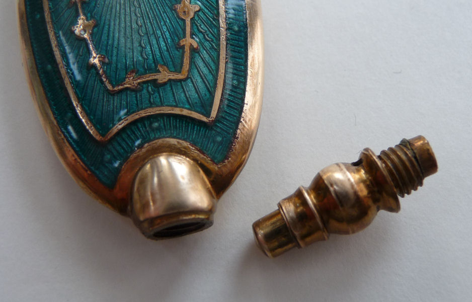 I just love the delicate details on this lovely early perfume with its extraordinary jeweled cloisonné cap. Both front and back are basically the same with shaped finger holds molded into the sides. But each side is decorated differently. It is truly a unique piece and unlike any I have seen before. I am not sure of the age as there is no mark on it at all but I believe it is a very early piece, possibly as early as first half of the 19th century. The piece is crazed but not discolored in any way and to me this is like fine age marks and do not bother me whatsoever. The enamel and the gold trim are in excellent condition with the only loss being the tips of the gold on the sides where the finger holds are. The top of the cap is done in cloisonné with a ruby jewel on the very tip. The inside of the cap is set with cork which seals the bottle completely from leakage so it is totally usable. What a gorgeous piece! Be sure to look at all the pics to see how unique it truly is. Overall the piece measures 4-3/8" tall x 1-3/4" wide at the widest points (finger holds) by 1" deep when lying flat. First time offered! (Click on pic for more photos.) |