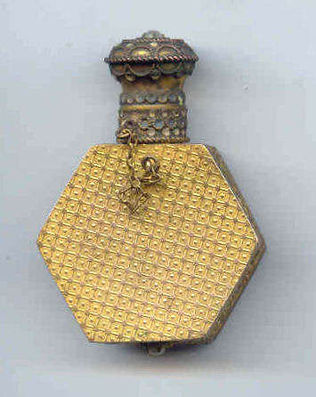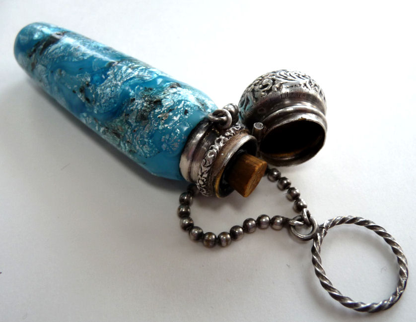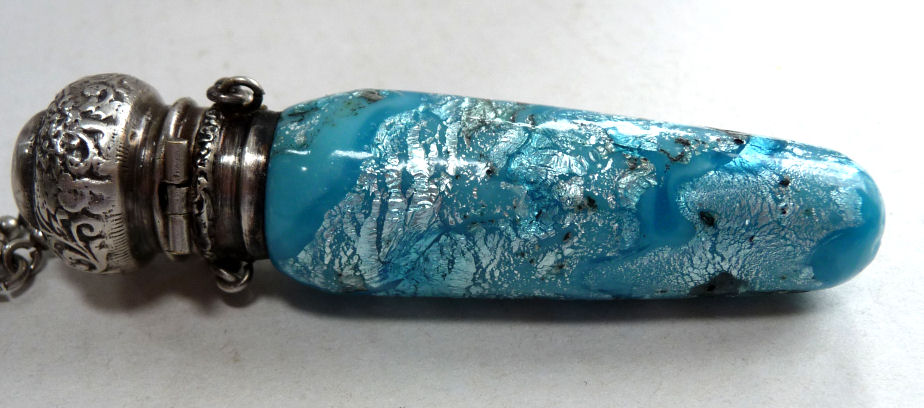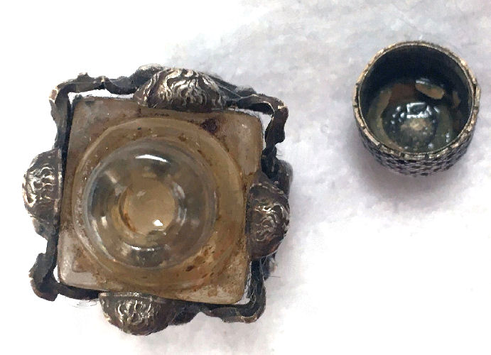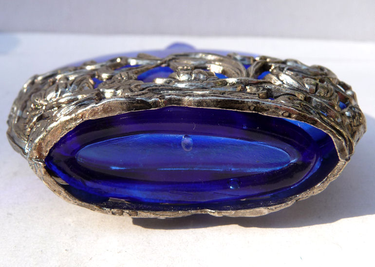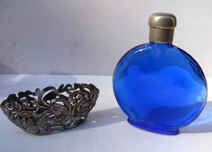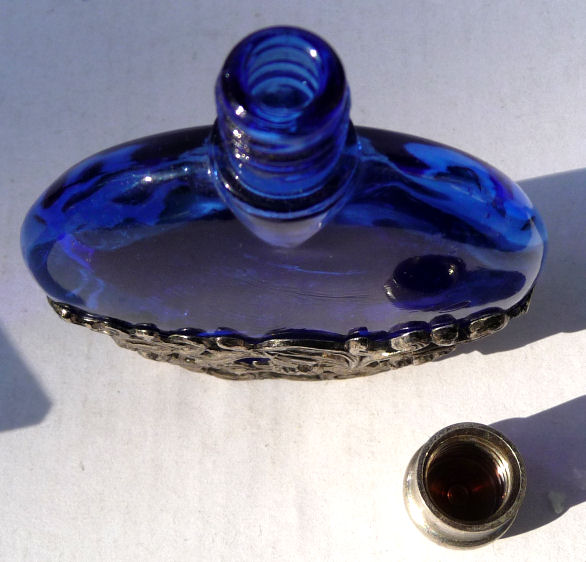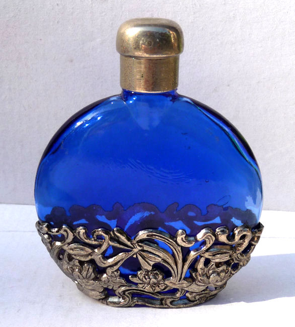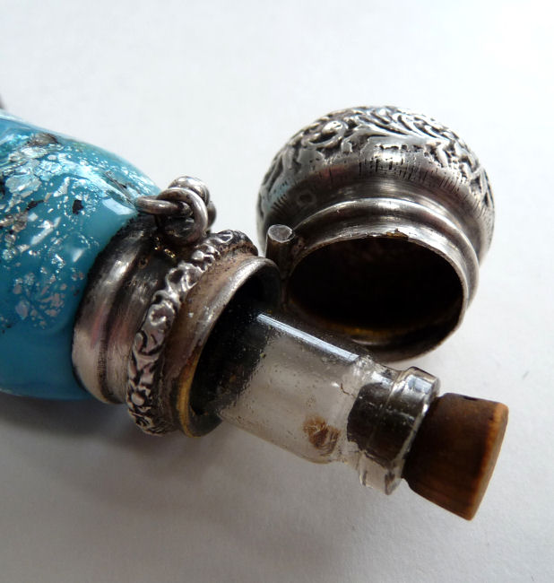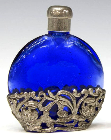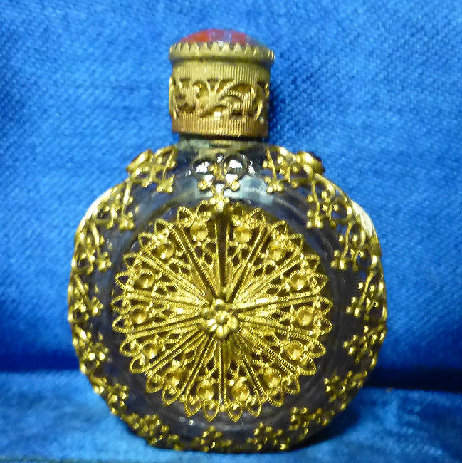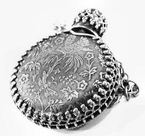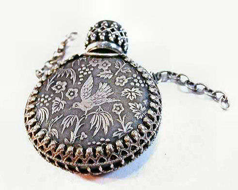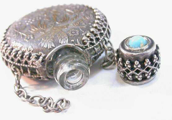 This is a highly unusual glass perfume bottle that is encased in a filigreed silvery mounting. The is a chain (broken) attached to each side, so I'm sure it was designed to be worn on a chatelaine. The screw-on cap has a turquoise jewel in the top. For as tiny as it is, the workmanship is superb. There is an embossed scene with birds on either side, so both sides are highly decorative. Excellent condition with exception of the broken chain (easily remedied). Measures 1-1/8" diameter x just over 1-1/2" high. (Click on pic for more photos.) |