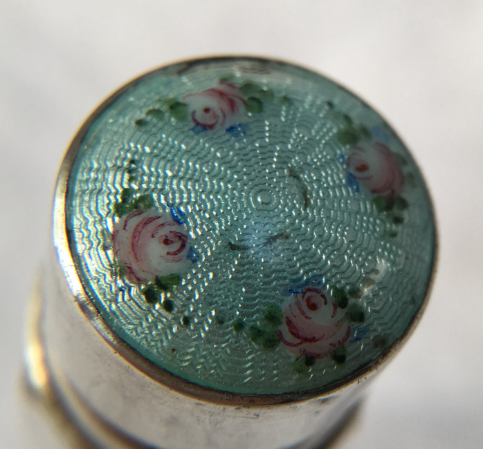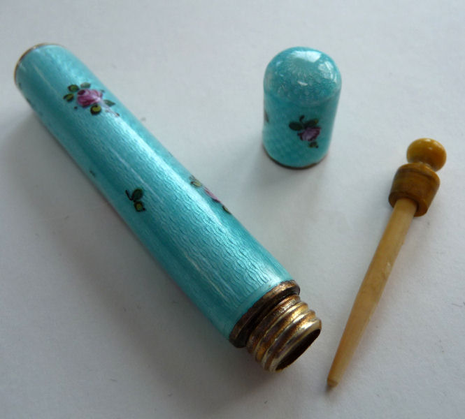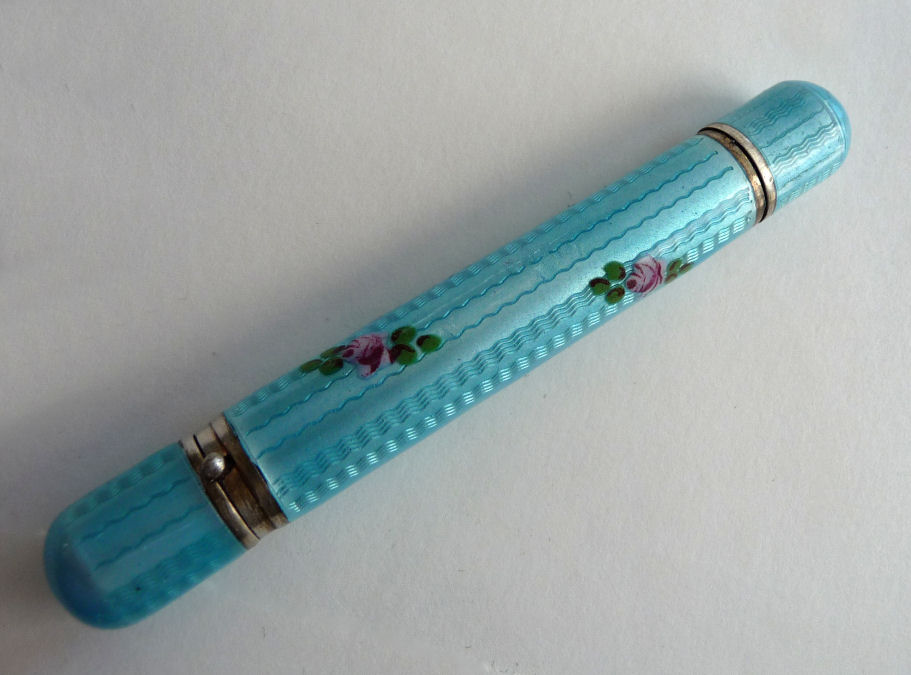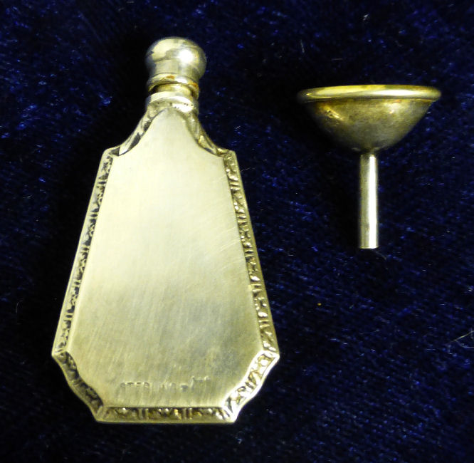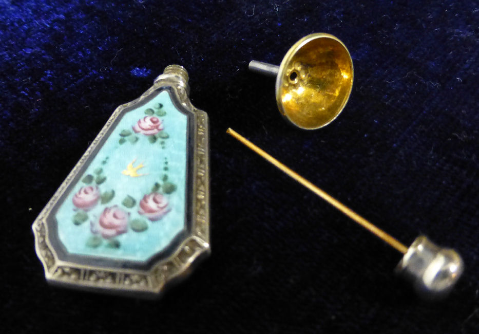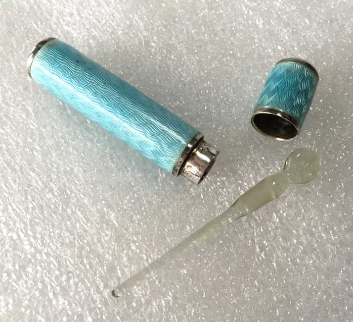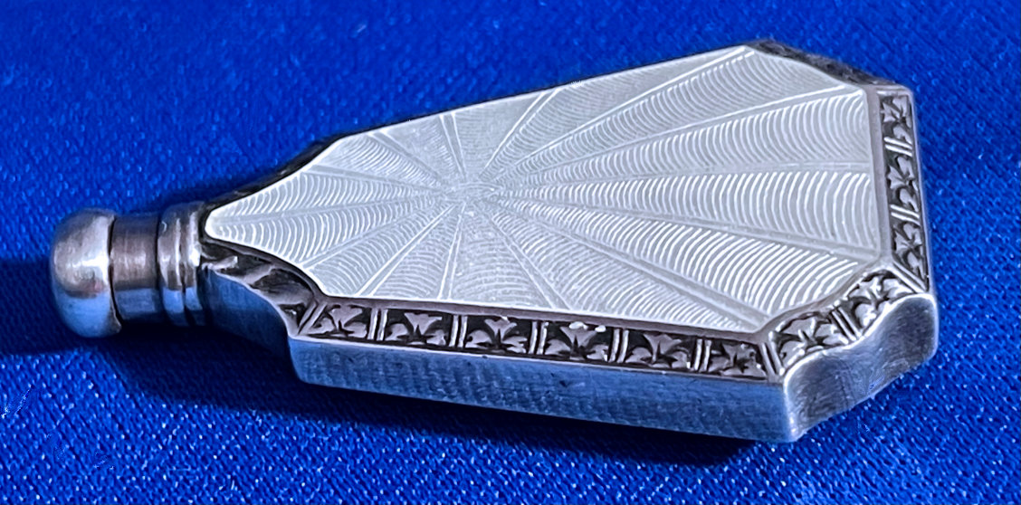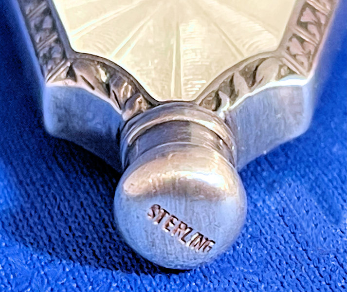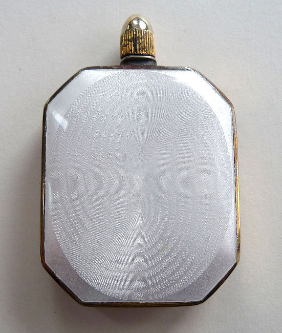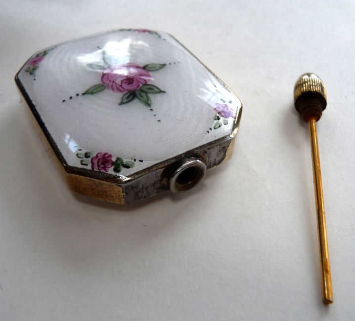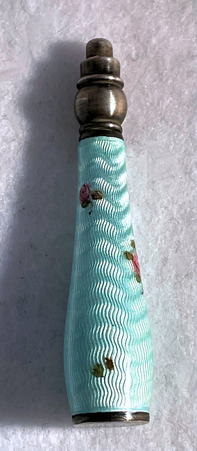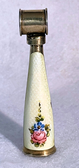 This beautiful little purse perfume is done in white enamel guilloche on sterling silver and was made by Thomae, one of the pre-eminent manufacturers of gorgeous lady's items from the early 20th century. This one has a very unique cap that I have never seen before ... it is an open "tube" where you can hang it from a cord or chain. This unscrews to reveal a long dauber. Both sides are done in white enamel guilloche with a hand-painted rose and forget-me-not at the bottom. It is signed Sterling and bears the hallmarks for Thomae on the base. This perfume is in excellent condition with no damage whatsoever. Measures 2-1/2" long x approx. 1/2" wide. (Click on pic for more photos.) |