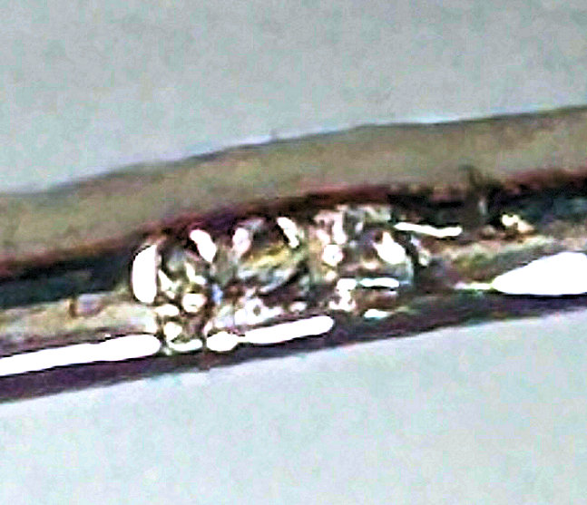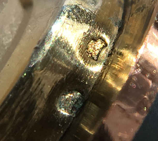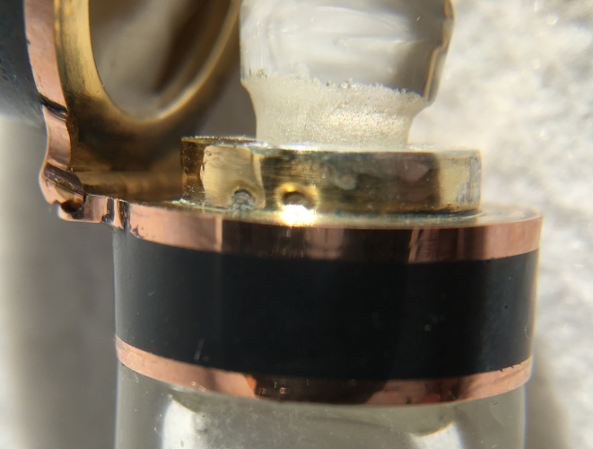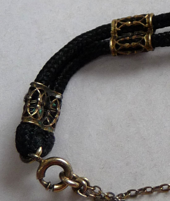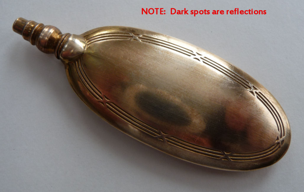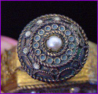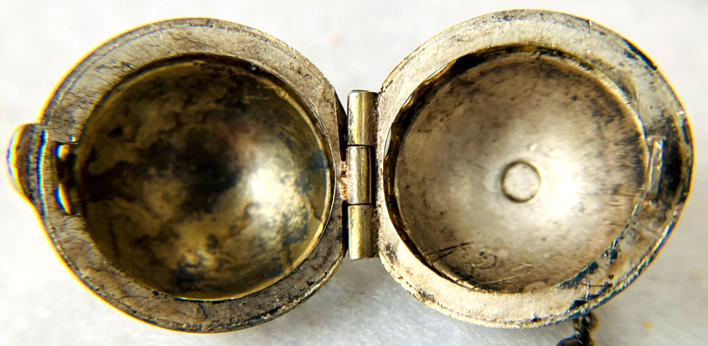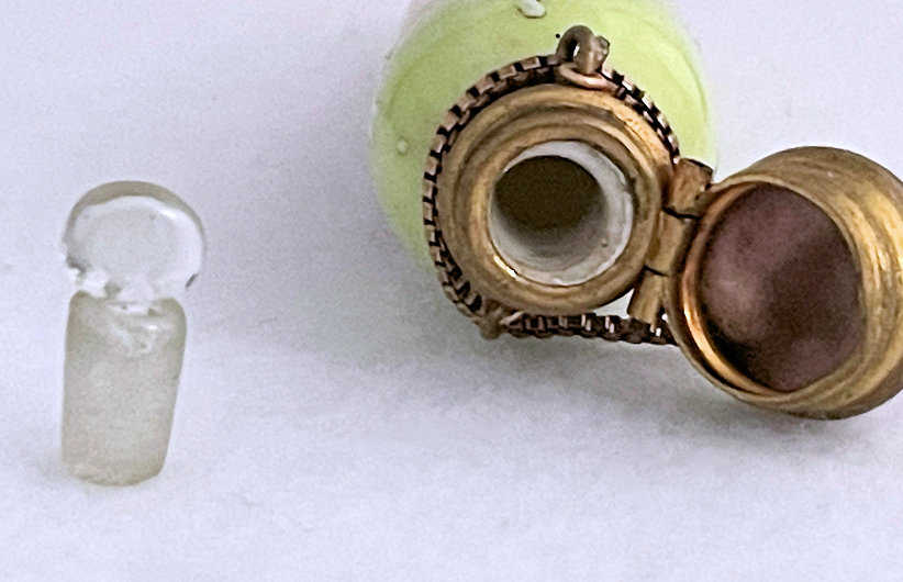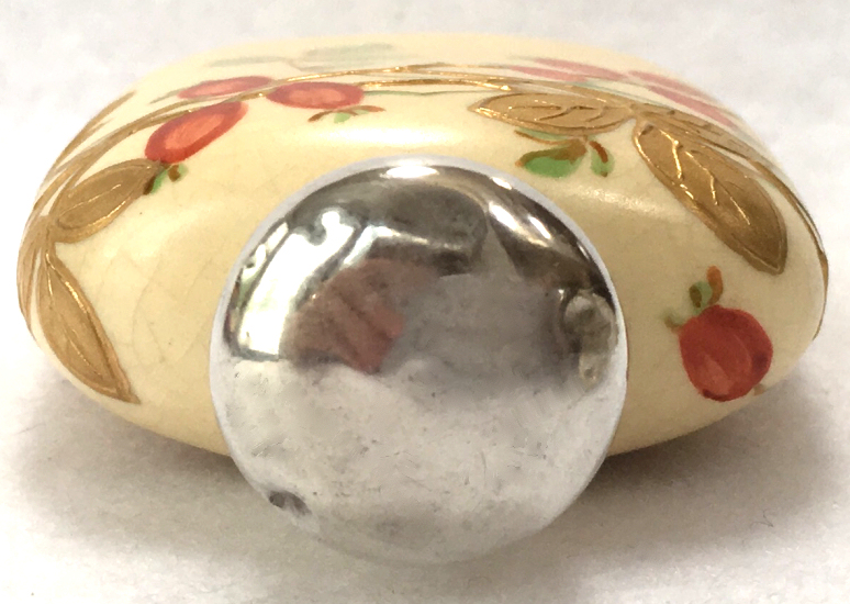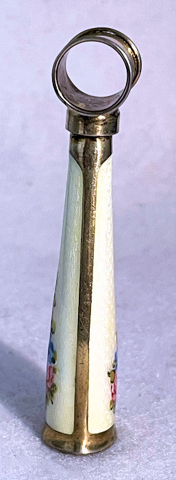 This is a sweet little egg-shaped yellow enamel guilloche pendant vinaigrette with hand-painted violets around the top edge ... very unusual to find these with any type of flowers or decoration on them. There is a ring for hanging on a necklace or a fob. Unfortunately, there is some enamel loss along one side where the two halves join and another wee bit at the bottom. All in all, a really cute little piece. There may have been a cap at the bottom to cover the screw tip, but I can't be sure. This is the way it was purchased and it works fine the way it is, so I can't say for certain. Measures approximately 3/4" long. (Click on pic for more photos.) |