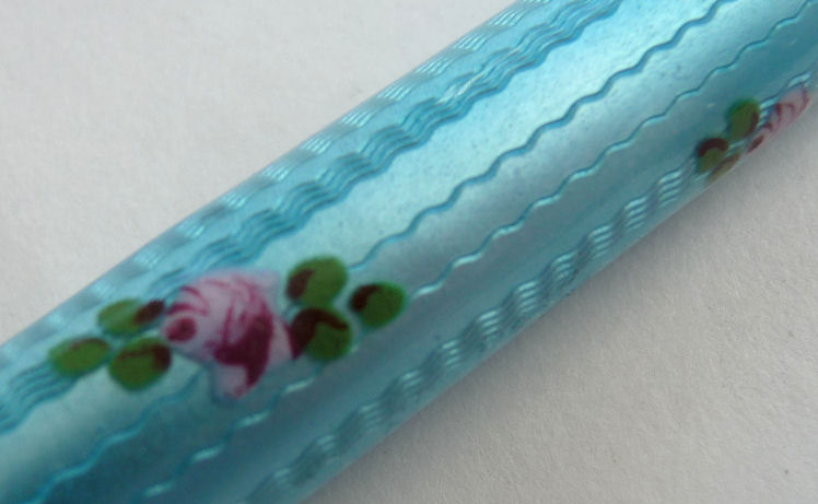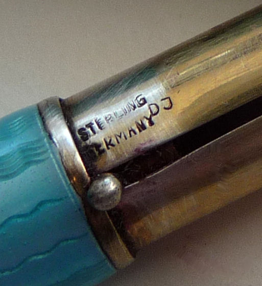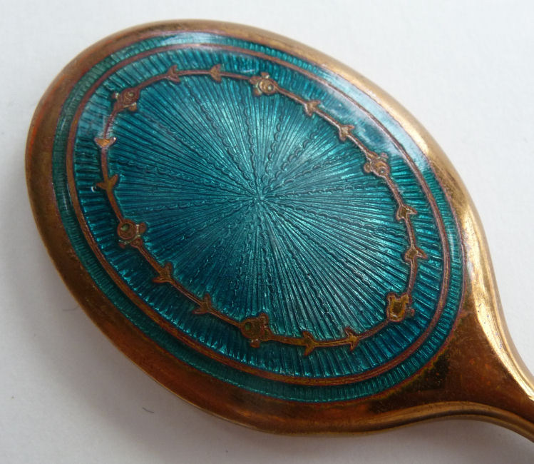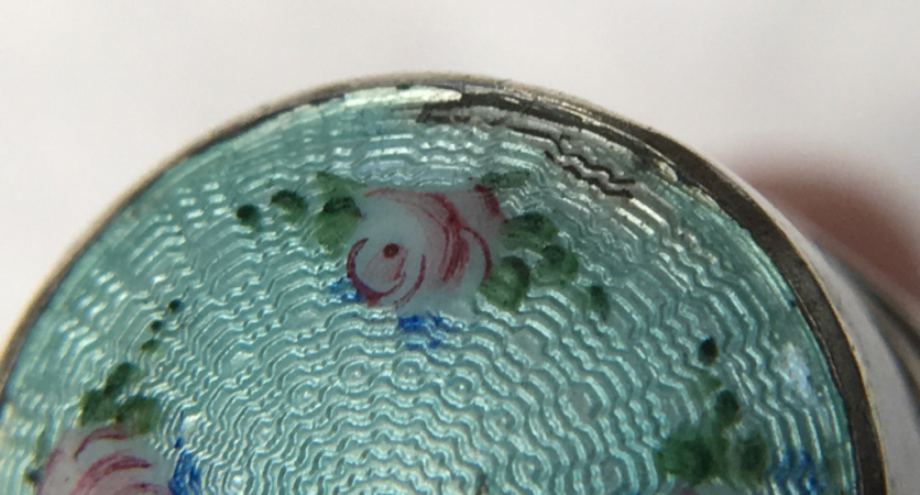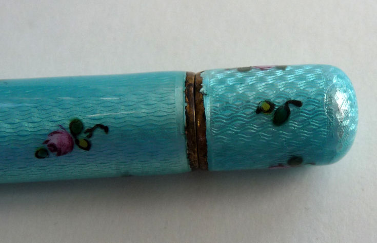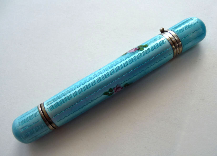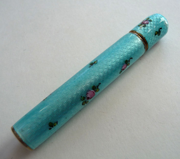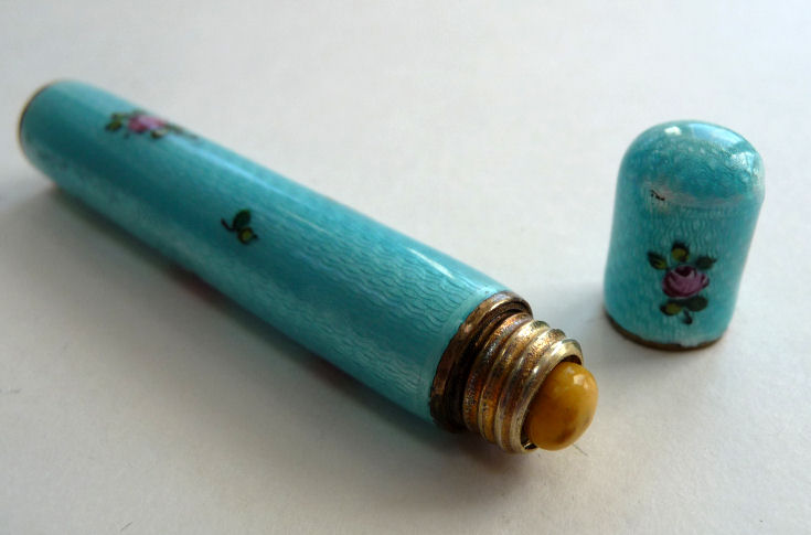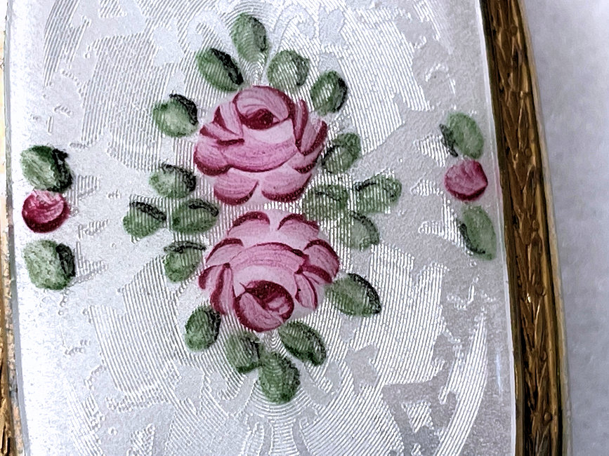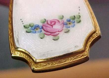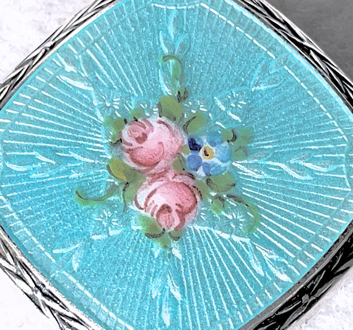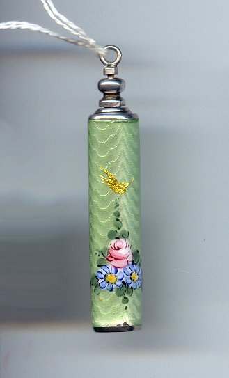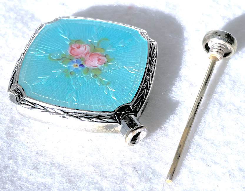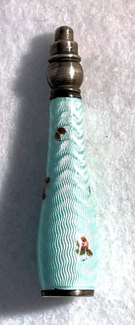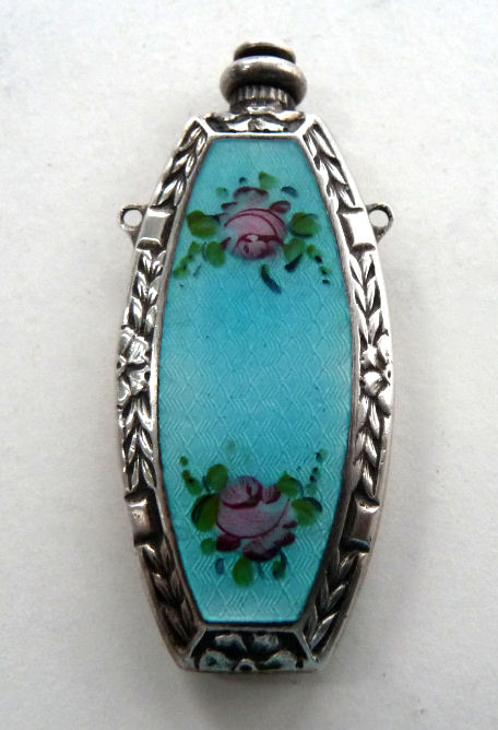 Here is a very rare gorgeous little enamel guilloche purse perfume done in pale aqua enamel guilloche on a sterling silver base. It has a hand-painted pink rose on the front and pink rosebuds and leaves scattered around the perimeter. It has a push-button top for dispensing a drop at a time and it is totally functional. The hallmarks are very hard to find but around the push button can be seen letters for STERLING and GERMANY. Overall this perfume is in excellent condition. Measures a bit over 2-1/8" long x approx. 1/2" diameter at the widest point.. (Click on pic for more photos.) |