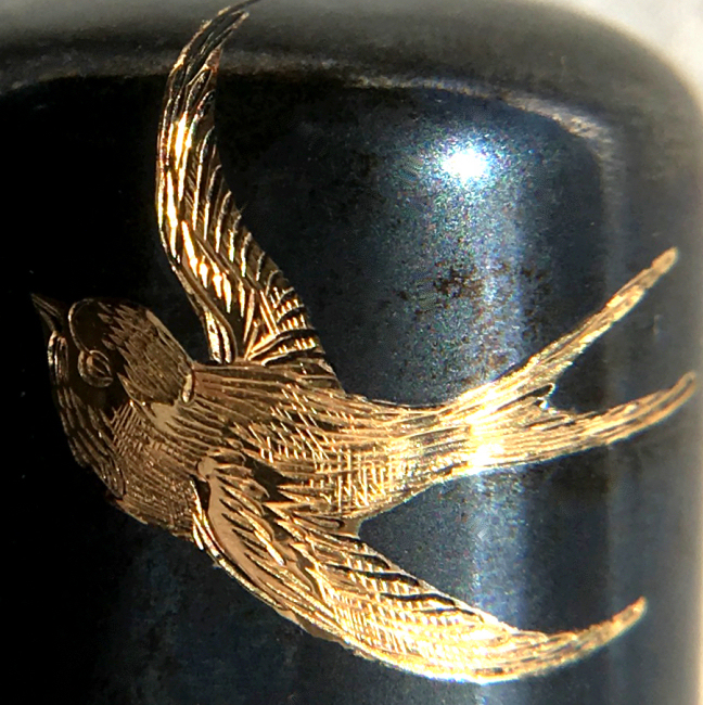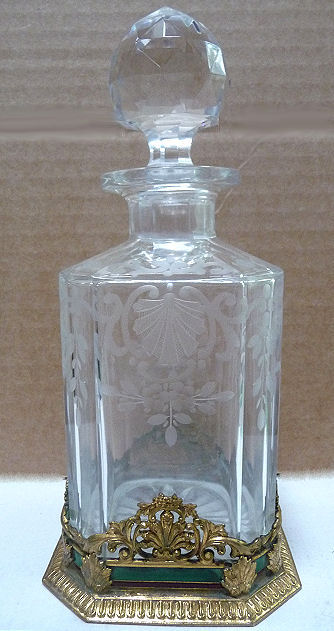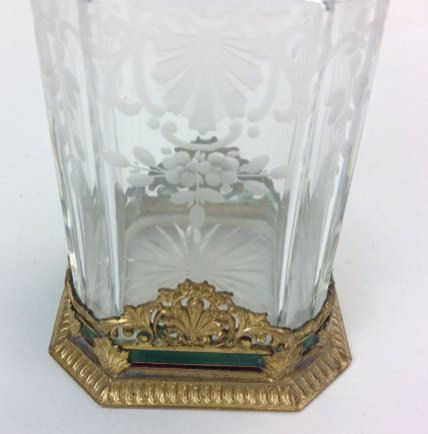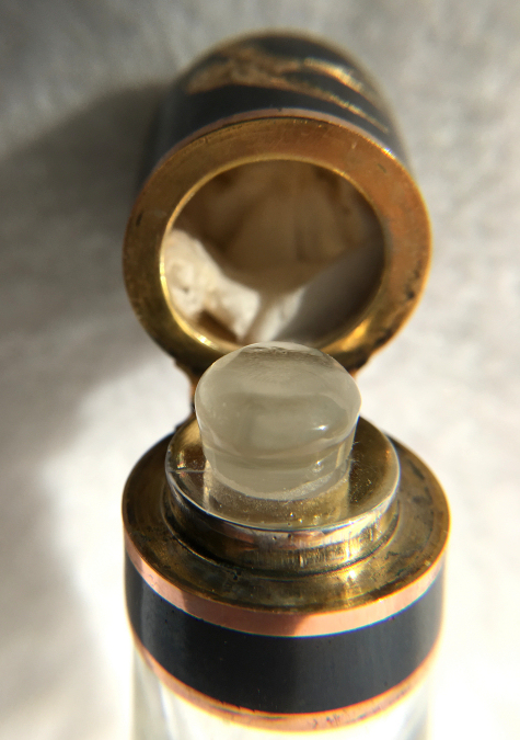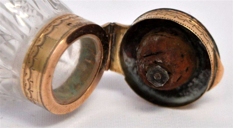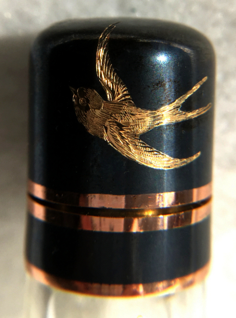 This beautiful etched glass perfume bottle was made in France and bears the Eagle's Head Guarantee Hallmark for 18 kt gold. The bottle portion has lovely etched ribbons and flowers typically found on pieces from Victorian times. I was told this piece was made in the 1860's when I purchased it; however, the maker's mark couldn't be read. The hallmarks are found on the rim of the cap and were researched by Marks4Antiques.com (their email will be included with the piece) which determined the 18kt gold stamp. The cap is done in Niello and has a carved swallow. When you lift the cap which is hinged, there is a glass stopper inside which fits snugly and is in excellent condition. The bottom of the bottle is polished and is in great condition as well. The top of the cap shows some wear to the Niello but not that noticeable unless looking for it. I have tried to include a picture but it was hard to get an accurate view since it is only visible when holding at a certain angle. Overall the piece measures 2-3/4" tall x 3/4" diameter. First time offered! (Click on pic for more photos.) |