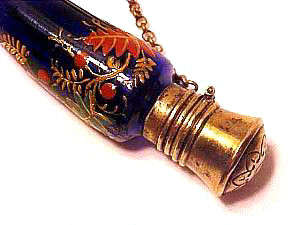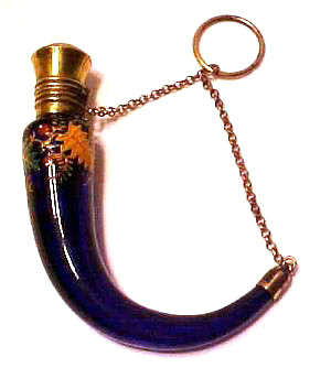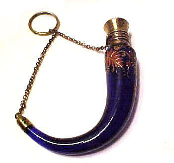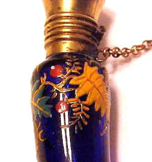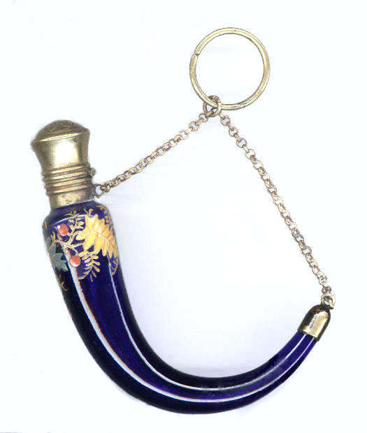 This is a gorgeous cobalt blue glass horn shaped perfume that has its original chain to suspend on a chatelaine. Dating from the 1800's, it is Victorian in nature and is just a beautifu lpiece of jewelry. The ring is large enough that one could have removed it and worn it as a finger attachment. The brass cap lifts up to expose a cork-capped opening. Cork seals the bottle but the lid doesn't snap real tight. There is engraving on the top of the lid (visible on last photo). The enameled decoration is all hand-painted and depicts leaves and berries in fall colors. Excellent condition! This is a most unusual and highly collectible perfume. Measures 3-5/8" when measured tip to tip. (Click on pic for more photos.) |