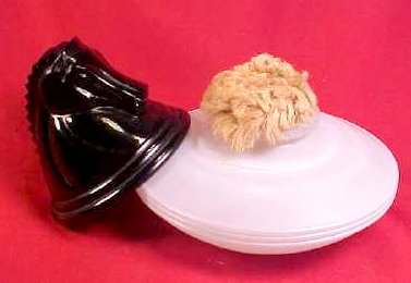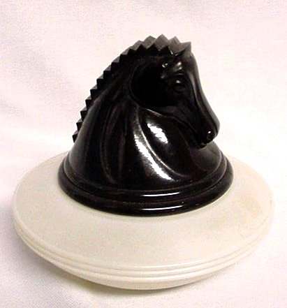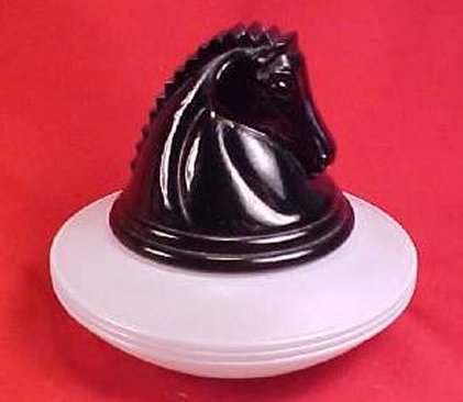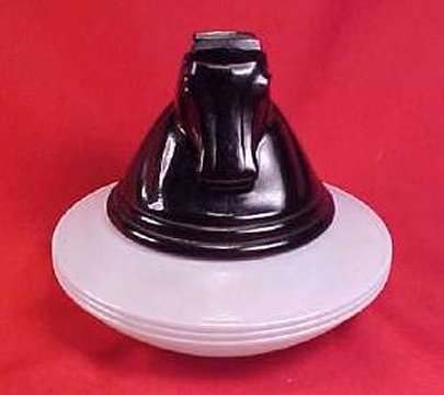Here we have a very rare piece ... made of glass with black deco Trojan horse head and white frosted base. Supposedly from a dress shop, this piece was made to fill with perfume or scented oil and when the head is removed, the wick will release the scent into the air. Dating from the late 20's, I'm sure there are not many of these still in existence. In fact, it is the only one I have ever seen! Glass is all in excellent condition with no chips or damage; all original. It's ready to use in your home! (Click on pic for more photos.) |