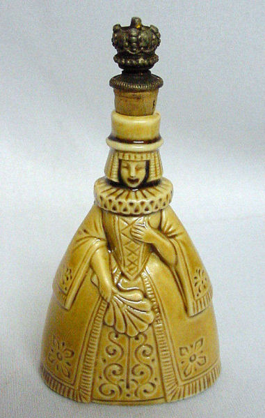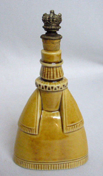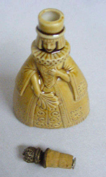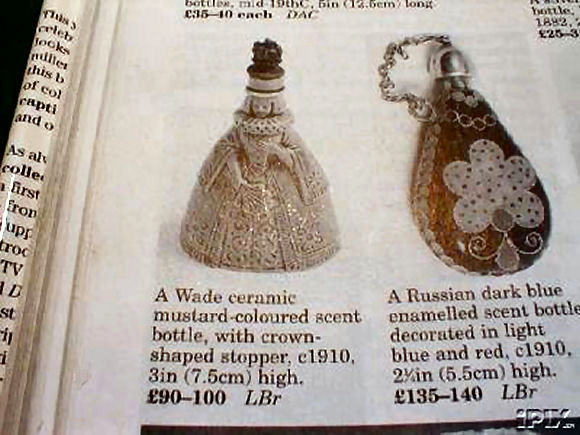 This regal scent bottle was made by Wade and is done in a figural with a crown-shaped stopper that resembles a queen. It is in mint condition. I have scanned an insert from the Miller's Price Guide which shows the bottle and dates it to 1910. A lovely addition to your collection! Measures 3-1/2" high x 1-7/8" wide x 1" deep. (Click on pic for more photos.) |