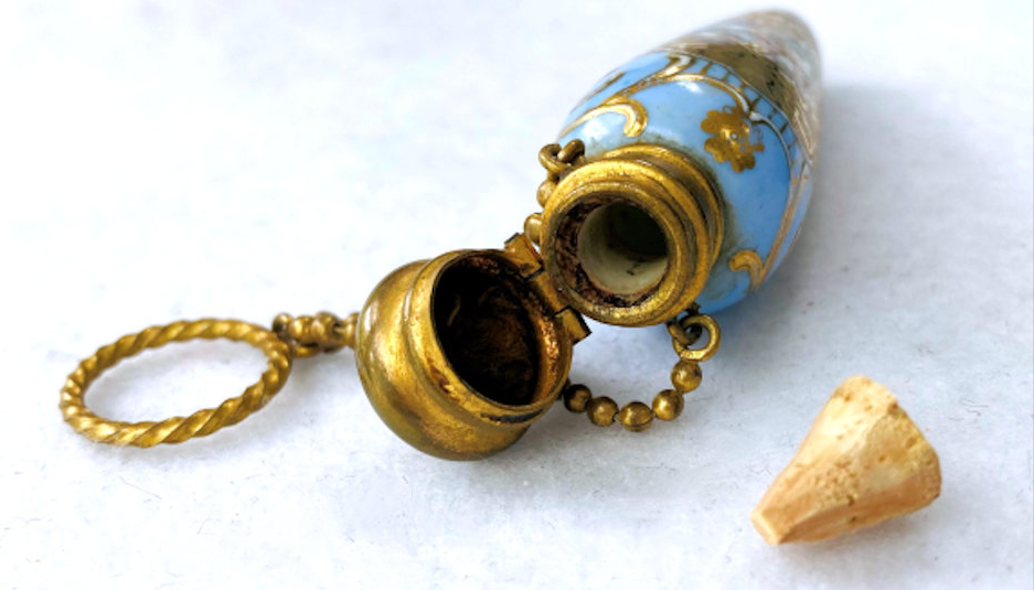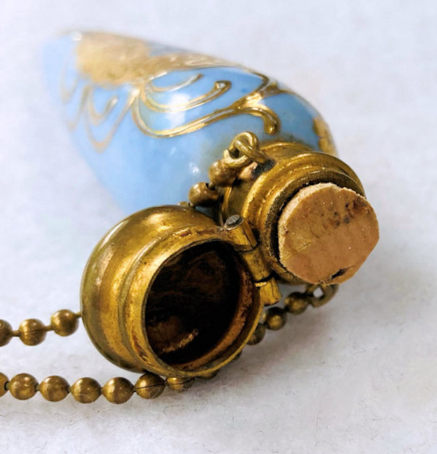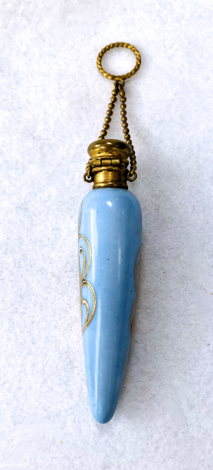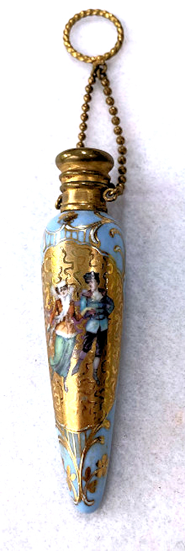 Gorgeous early chatelaine perfume or scent bottle with figural scene of a romantic couple clad in fur-trimmed outfits skating together. Their outfits are reminiscent of Russian clothing of that era. The figures are backed in gold gilt and the body of the bottle is blue porcelain teardrop shape. The perfume is suspended on a beaded brass chain with a tiny ring to attach it to a chatelaine. The brass cap covers the (replaced) cork stopper inside. The bottle is in excellent shape with no chips or cracks or hairlines of any kind. There is some very minimal wear to the high spots on the gold embellishments but this just gives it even more character and beauty and I consider it part of the patina of the overall item. The brass fittings also have a beautiful rich patina from age and I would advise against polishing. This gorgeous little bottle measures 3-1/2" from cap to tip x 7/8" wide. From top of ring to bottom it measures almost 5-3/4". The ring is about 5/8" diameter. (Click on pic for more photos.) |
