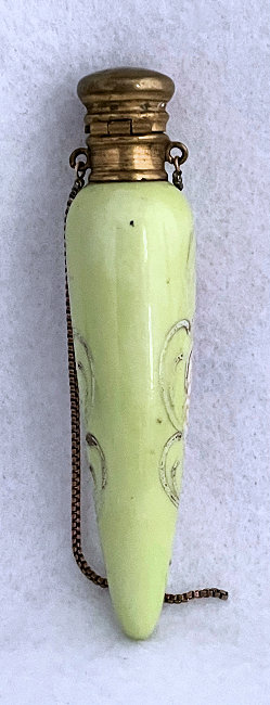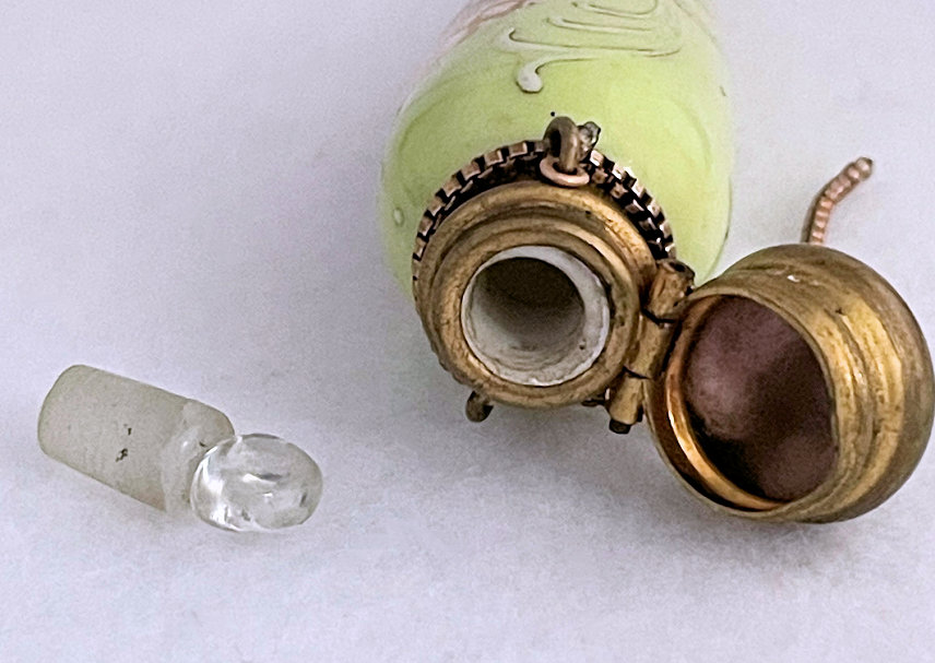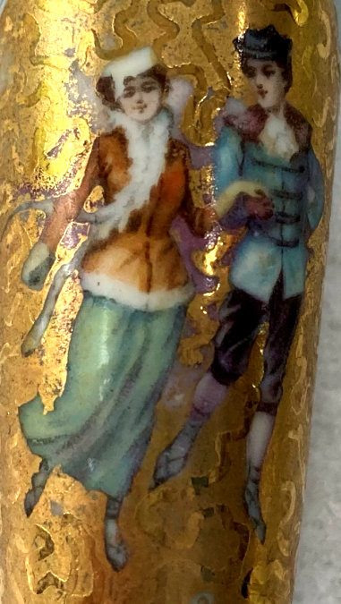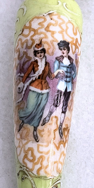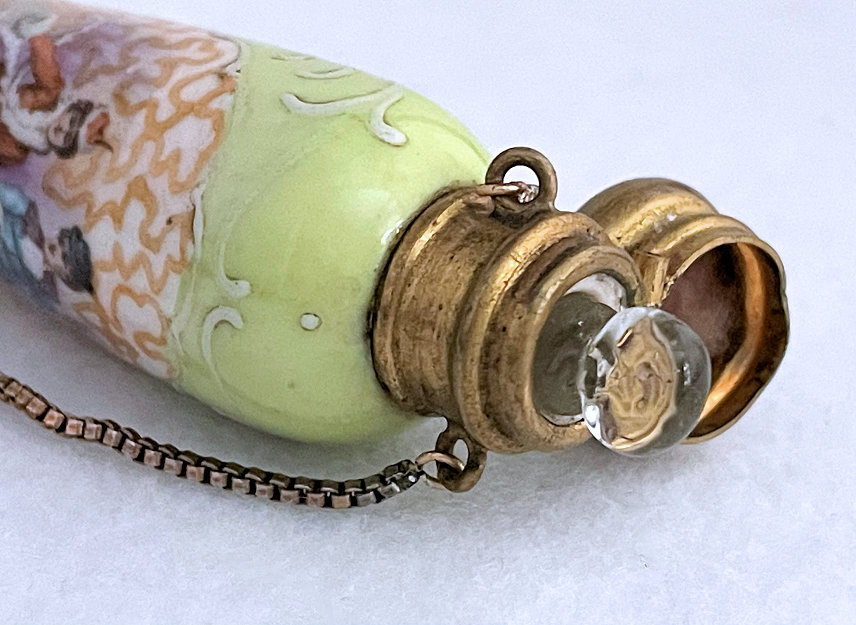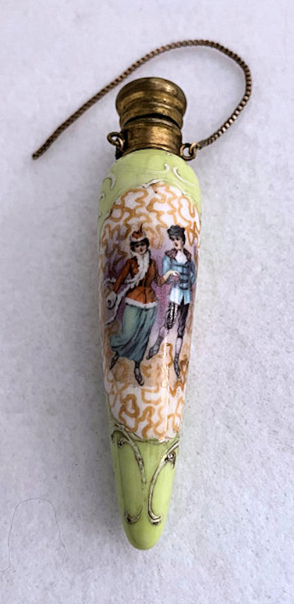 Gorgeous early porcelain perfume or scent bottle with figural scene of a romantic couple clad in fur-trimmed outfits skating together. Their outfits are reminiscent of Russian clothing of that era. The bottle is a pale green teardrop shape with some raised gilt flourishes surrounding the scene in the center although much of the gilt is worn off. The perfume has a gold chain which attaches to little rings on either side but the chain is broken. I assume this could be soldered by a jeweler but I have not had this done. The brass cap covers the glass stopper inside. The porcelain is in excellent shape with no chips or cracks or hairlines of any kind. The brass fittings have a beautiful rich patina from age and I would advise against polishing. This gorgeous little bottle measures 3-1/2" from cap to tip x 7/8" wide. (Click on pic for more photos.) |