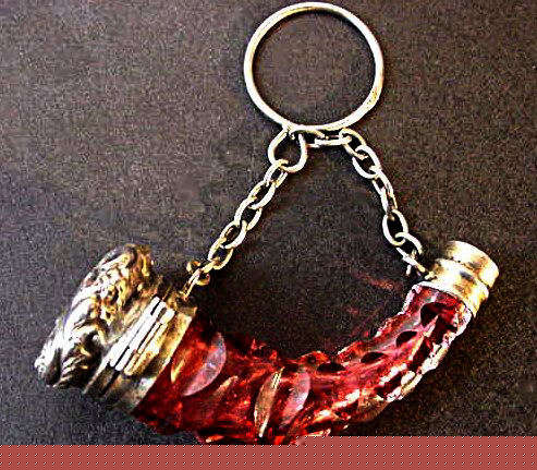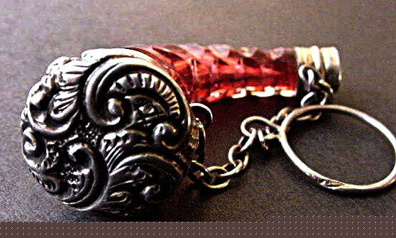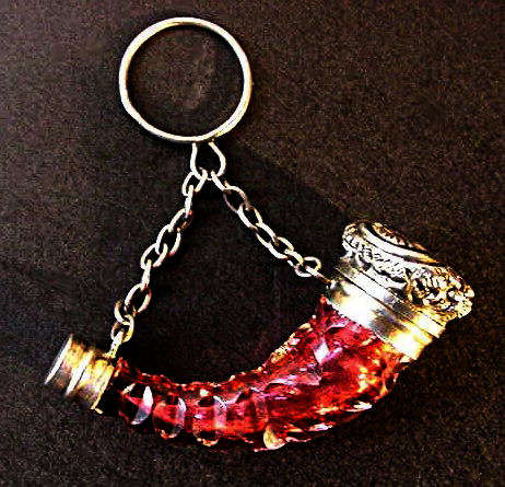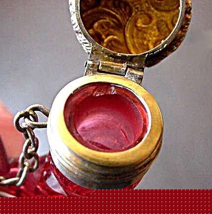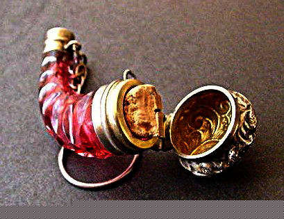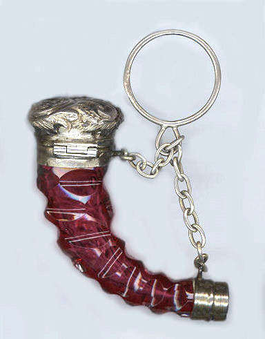 This is a darling little cut cranberry glass horn shaped perfume that has its original chain to suspend on a chatelaine. Dating from the 1800's, it is Victorian in nature and is just a beautiful piece of jewelry. The ring is large enough that one could have removed it and worn it as a finger attachment. The silver repousee' cap lifts up to expose a cork-capped opening. Lid snaps shut nicely. Excellent condition with the exception of one very teeny fleabite visible in pics ... doesn't show at all with cork stopper in place. This is a most unusual and highly collectible perfume. Measures 2-1/4" when measured tip to tip. (Click on pic for more photos.) |