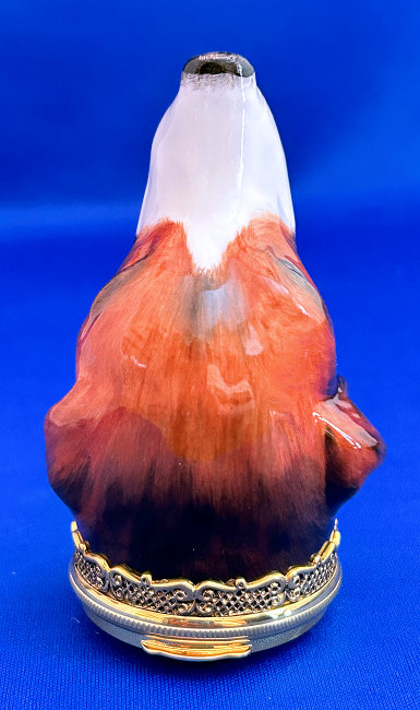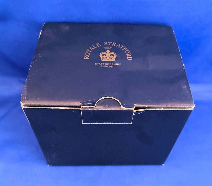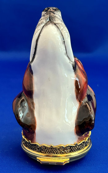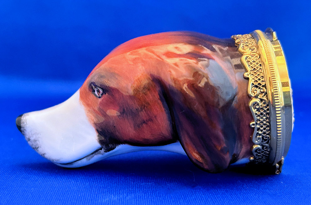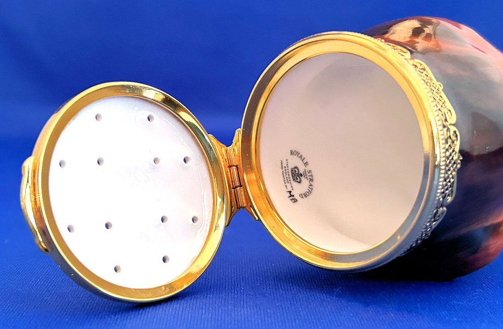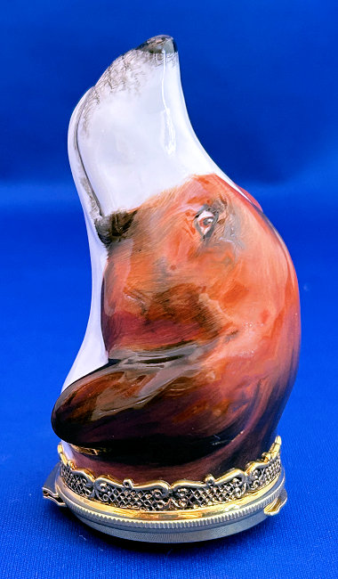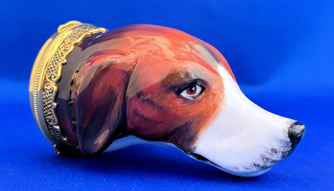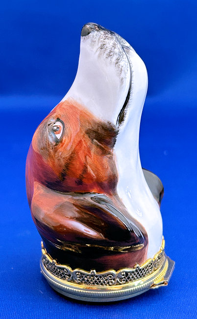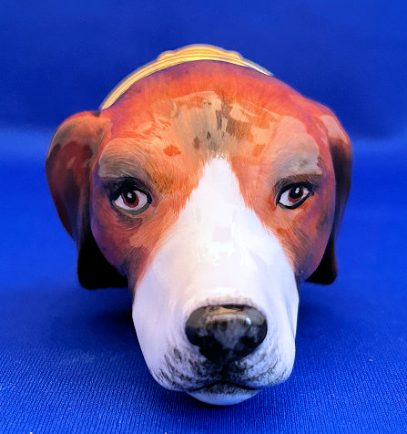 This lovely porcelain vinaigrette has been in my collection since the 1990's. He is a very realistic hand-painted fox hound and was made in the 1980's (at least at the estate sale where I bought it that is what I was told). The gold gilt collar is spectacular in its openwork pattern which is replicated in the design on the lid. The lid is pierced so you can put cotton inside with some perfume to waft out and make your drawers smell good. You could also use it for potpourri for the same purpose. Others have used these for trinkets ... totally up to you. The lid will stay closed but it was not made with a snap so don't expect it to snap shut tightly. This lovely piece comes in its original box and is in pristine, like brand new condition. It is signed inside with the artist's initials "MB" and marked "Royale Stratford, Staffordshire, England, Hand Painted by MB". It measures 3-1/2" long and the lid is 1-7/8" diameter. The hound measures 2-1/4" wide at the ears. They don't get much better than this! (Click on pic for more photos.) |