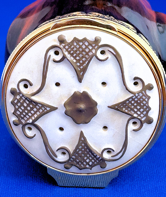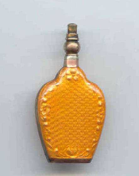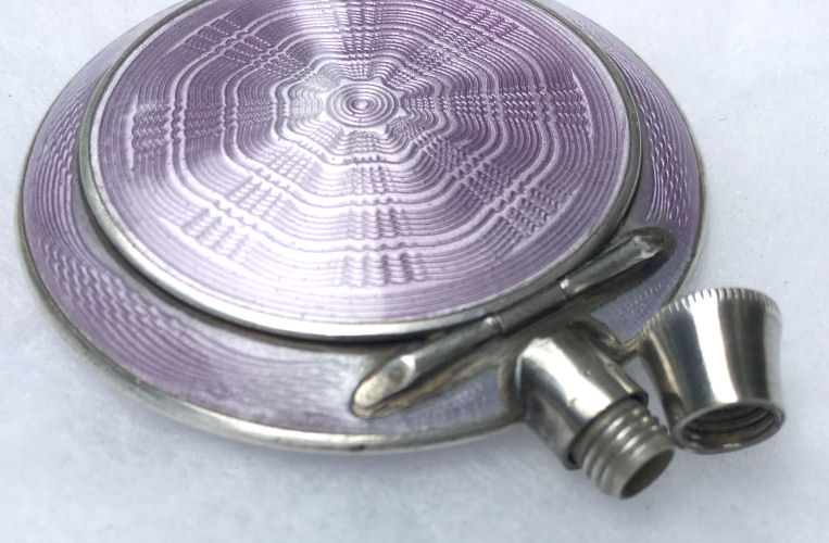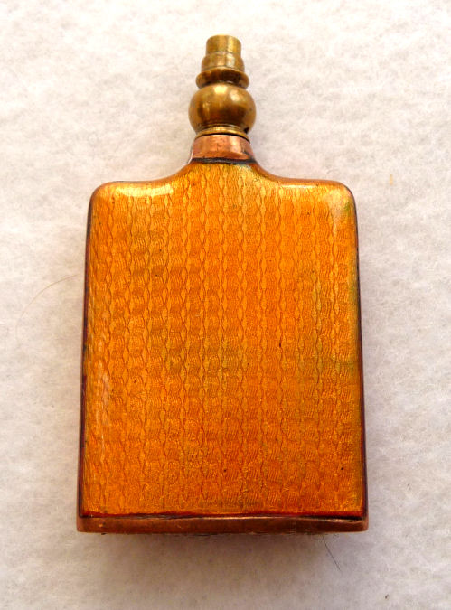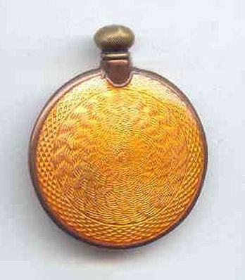 This is an adorable little round purse perfume done on both sides in identical peach enamel guilloche. Body of perfume is a brass or copper metal. The cap may not be original as it does not screw on properly and, at the moment, is simply loosely on the top. I am seeking a replacement or a way to make it fit snugly in the meantime. Measures 1-3/8" diameter x 1-3/4" high. Excellent condition with exception of loose lid. (Click on pic for more photos.) |
