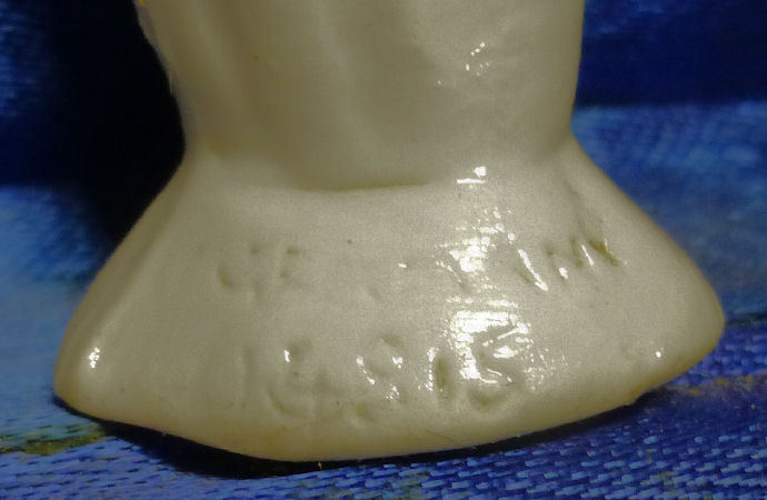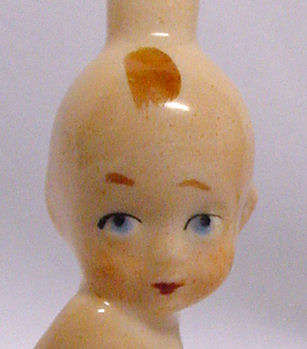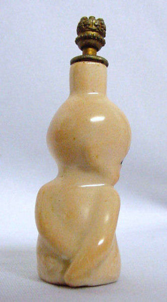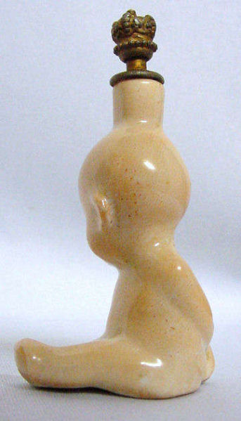 Don't you just want to kiss her? This adorable little German-made porcelain perfume bottle is done in the style of the famous little Kewpie dolls ... it is just darling. Just look at that expression! All hand-painted, very nice lifelike coloring and gorgeous blue eyes! Comes with crown stopper. Marked Germany and 37 on base. Perfect condition with no damage of any kind. Measures 3" high x 1-1/2" long x 1" wide. (Click on pic for more photos.) |