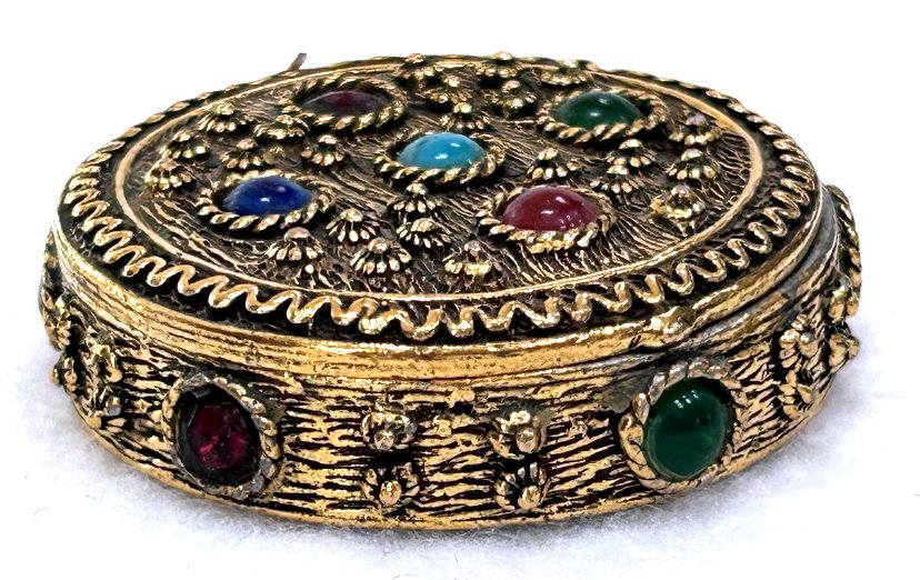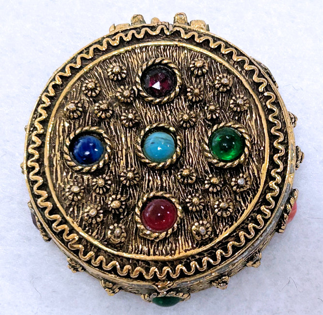 This sweet little solid perfume is the perfect size to tuck into your purse! Made by Mary Chess, it has beautiful deatailing and studded with jewels on the top and sides. The lid is spring-loaded so it stays tightly closed. Inside you will still find mostly unused cream perfume which still has a beautiful scent. Overall it is in excellent condition only missing one jewel from the side. It measures 1-1/2" diameter x 1/2" thick. (Click on pic for more photos.) |