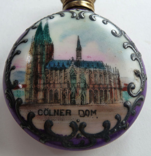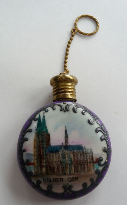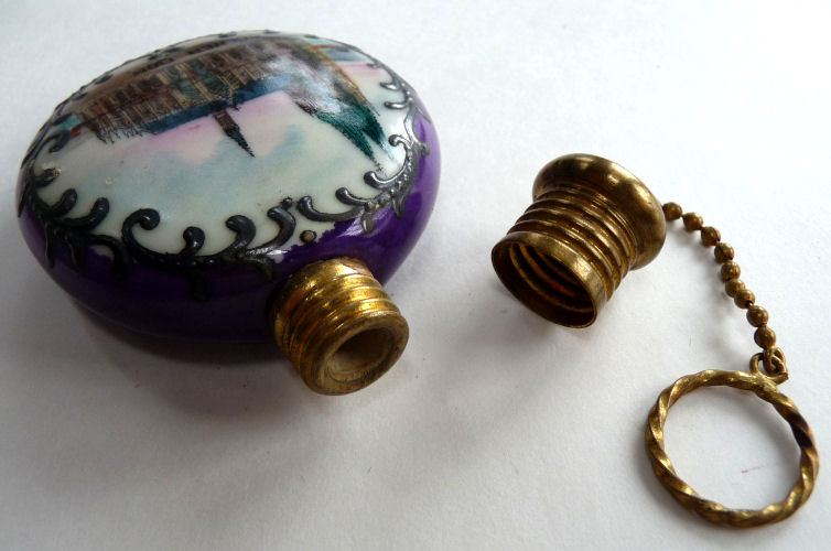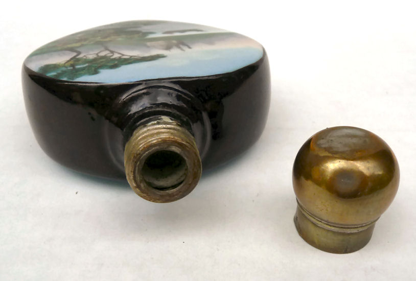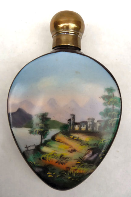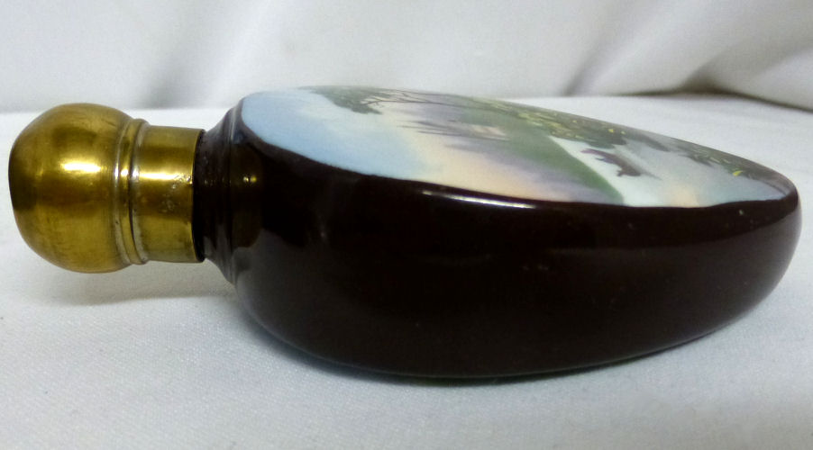This beautiful hand-painted perfume bottle has two completely different designs ... on the "front" (both sides are interchangeable so there is technically no specific front or back), there is a lake with a couple in a rowboat and a castle in the background. On the reverse side is a terraced hillside with a castle and mountains in the background. The brass cap unscrews to an open neck (I will include a cork stopper if you would like to use it). What makes this especially unusual is the HUGE size ... unlike most purse perfumes which measure an inch or two, this one is 3-1/4" tall (not counting cap) by 2-1/2" wide x 1" deep at the neck tapering to 5/8" at the bottom point. The cap has a few dents as visible in the pictures. Other than that the bottle is in perfect condition. The sides are a chocolate brown shade. (Click on pic for more photos.) |