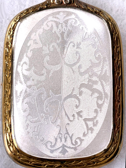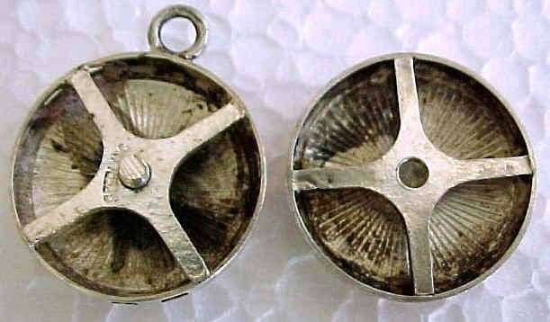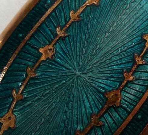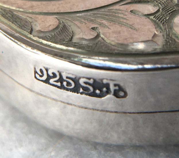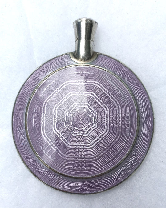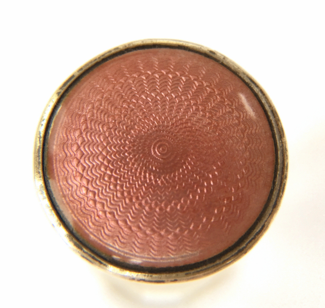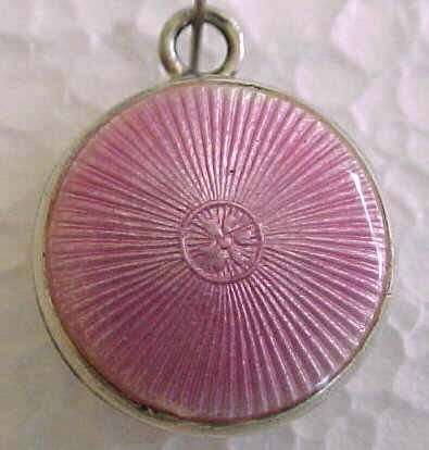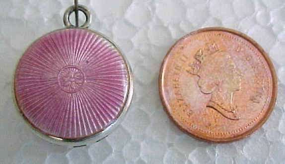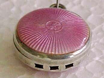 They say the best things come in small packages and this is a perfect example of that! This is a teeny tiny little pink enamel guilloche vinagrette pendant that is HUGE on beauty and looks! The design in the guilloche has a tiny little flower in the center with lines radiating around it in a sunburse pattern. Just gorgeous! There are little vent holes all around the outer edge so that the fragrance can waft out. The enameling is on both front and back and is identical, so when wearing on a chain, it will be just as lovely from either side. Marked "Sterling" on the inside (see photo). Excellent condition throughout ... there is one area at bottom edge where clear top coat didn't quite make it to edge, but it is only noticeable under magnification. Measures just under 3/4" diameter and is about 1/4" thick. (Click on pic for more photos.) |
