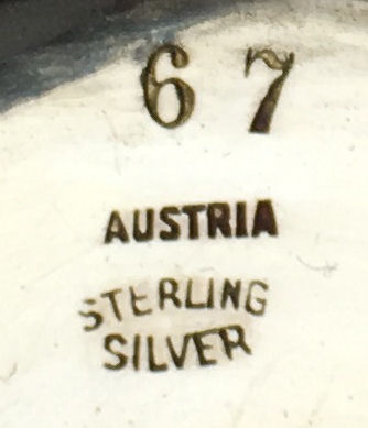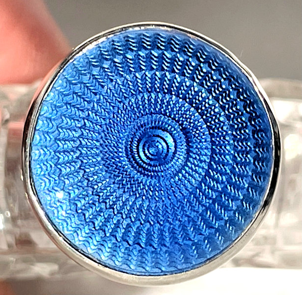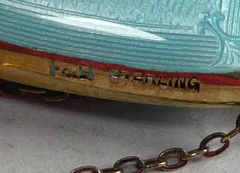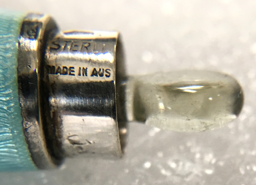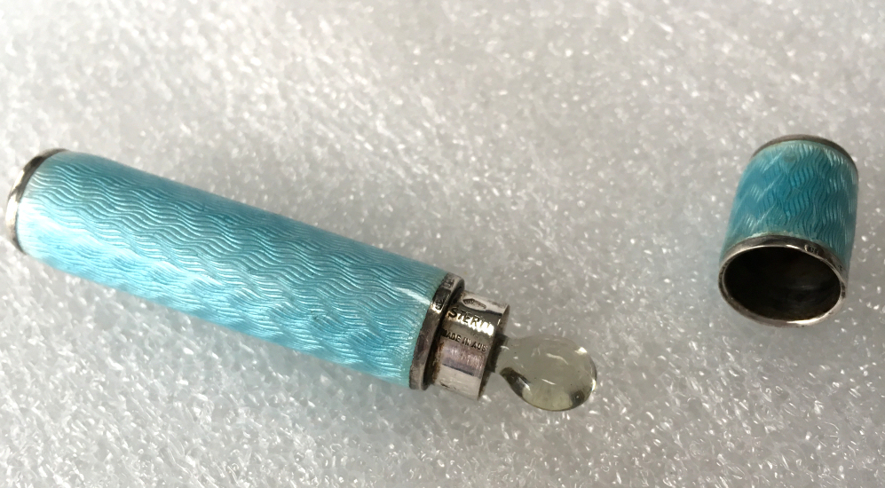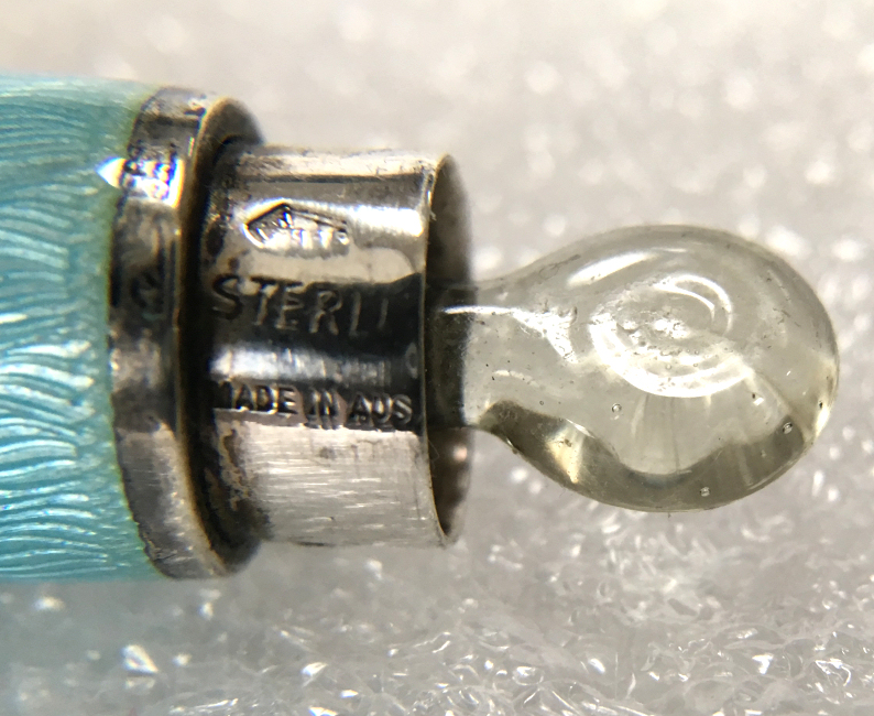 Here we have a darling little sterling silver aqua blue enamel guilloche purse perfume made in Austria. The fittings are all sterling silver and it bears assay marks for Austria. It also says STERLING and Made In Aus on the cap. The assay mark has the initials "LW" and 925 but I have been unable to trace the LW name. If anyone knows, please feel free to message me. The cap is not threaded but it does fit snugly and will stay secure. Inside there is a glass dauber in perfect condition. Overall this entire piece is in excellent shape with no apologies whatsoever. It is totally usable if someone would choose to do so. Measures 2-3/8" long. (Click on pic for more photos.) |