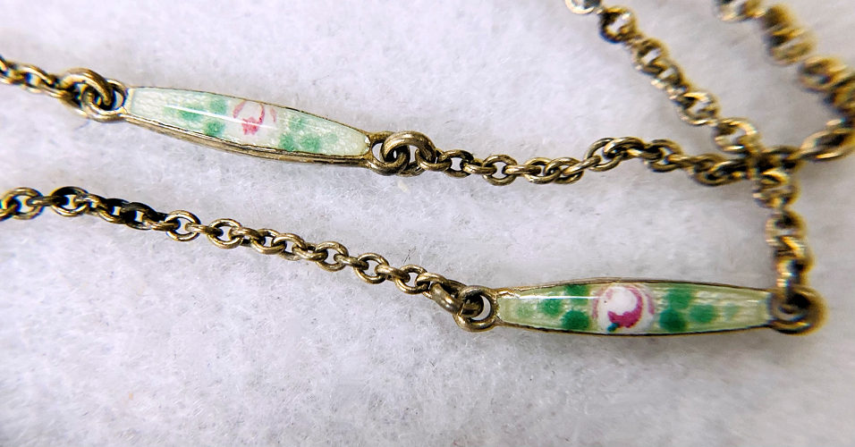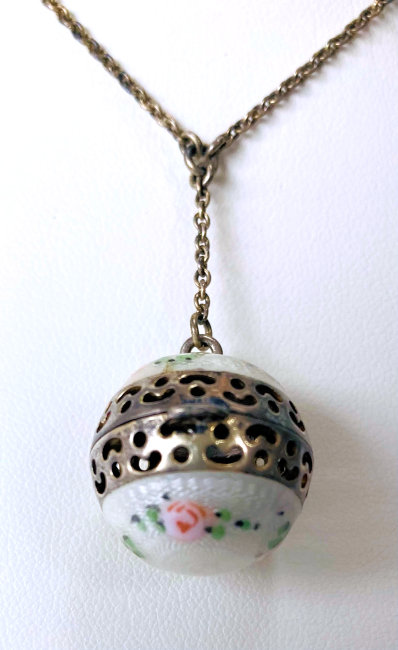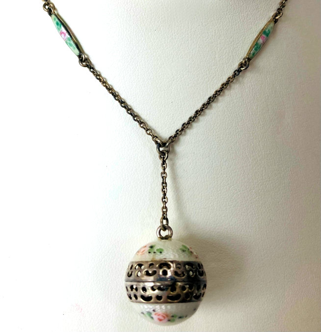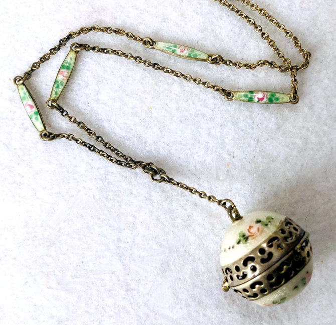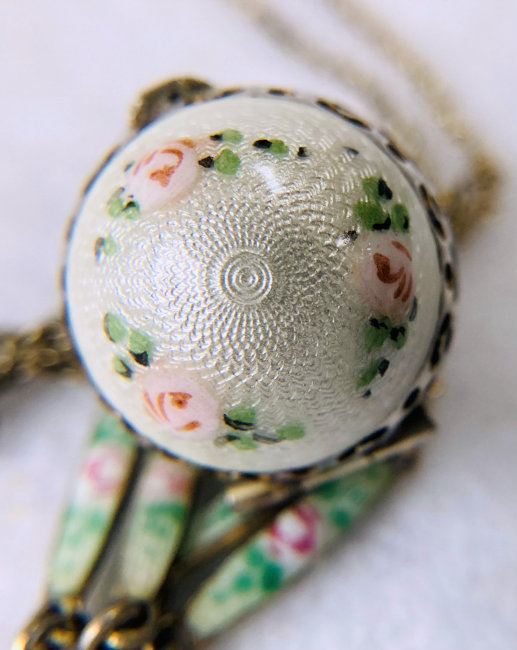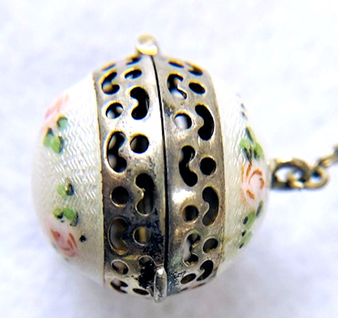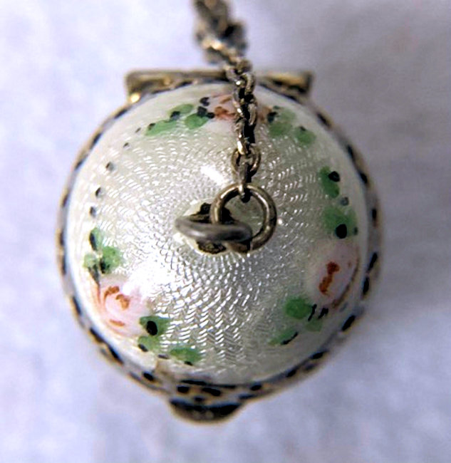 This is just a lovely little ball-shaped white enamel guilloche pendant vinaigrette with hand-painted roses around the top and bottom halves ... very unusual to find these with any type of flowers or decoration on them. It comes with a matching Y shape chainlink necklace with four enamel guilloche links with hand-painted roses on each. The links appear to have a pale green background but it is very very light and looks great with the perfume. It is the chain that came with it when I bought it and I am keeping it together. The openwork around the center of the vinaigrette is exceptionally pretty. It is more than likely sterling, but since I could not find a hallmark on it, I am selling as "probably". It is in absolutely perfect condition! Measures a tad over 3/4" diameter and the Y chain drop is 10-1/2" overall.. (Click on pic for more photos.) |
