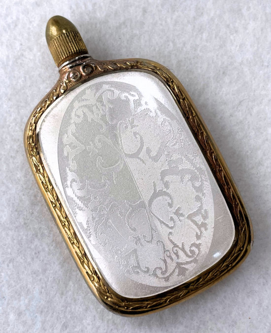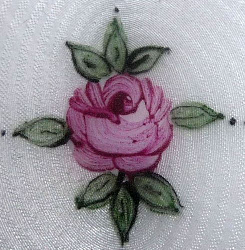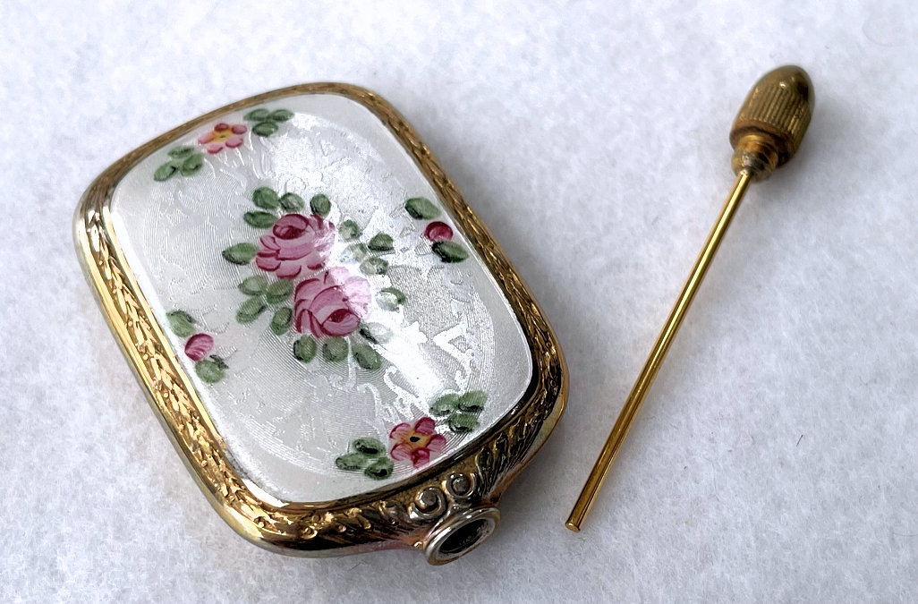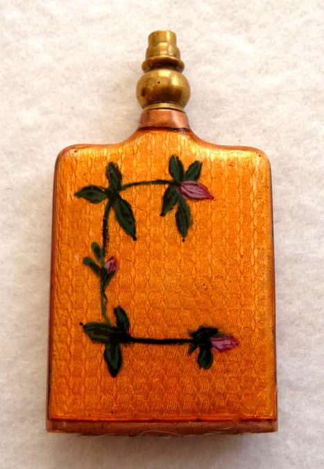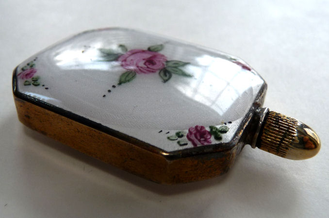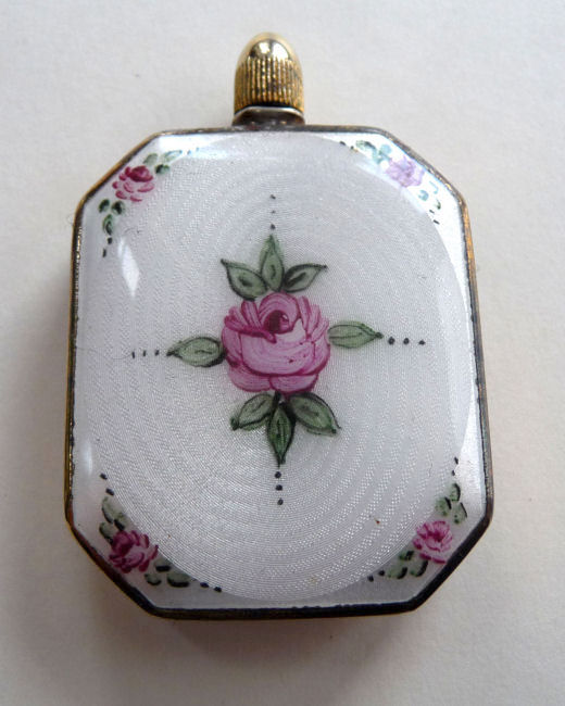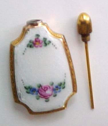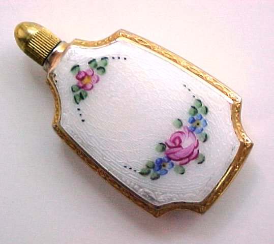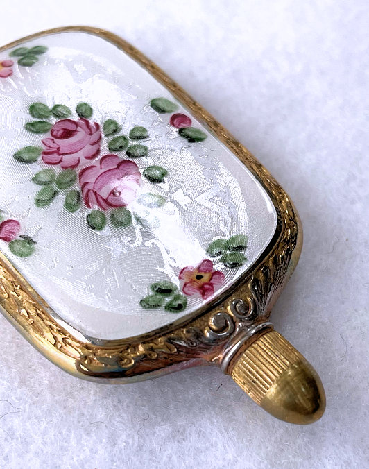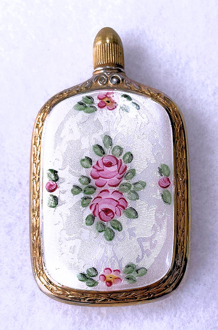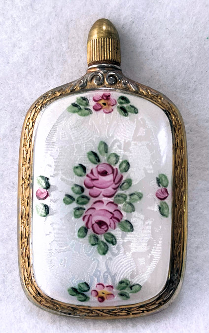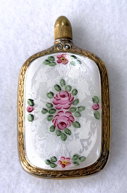This is a beautiful little double enamel guilloche perfume in snowy white with pink roses on the center and four edges. The guilloche pattern is done in a beautiful design that shows through the white background. The back has undecorated white enamel guilloche in the same design as the front. The shape of the bottle itself is rectangular with rounded corners and the edges are all embossed in acanthus leaves. Cap unscrews and has a dauber attached. Enameling is all excellent with no chips or damage of any kind. Some of the gold gilt finish is worn on the edges (it will look more silver in the photos) but is mostly intact. Unmarked. Measures 2-1/4" long (counting cap) x 1-5/16" wide. (Click on pic for more photos.) |