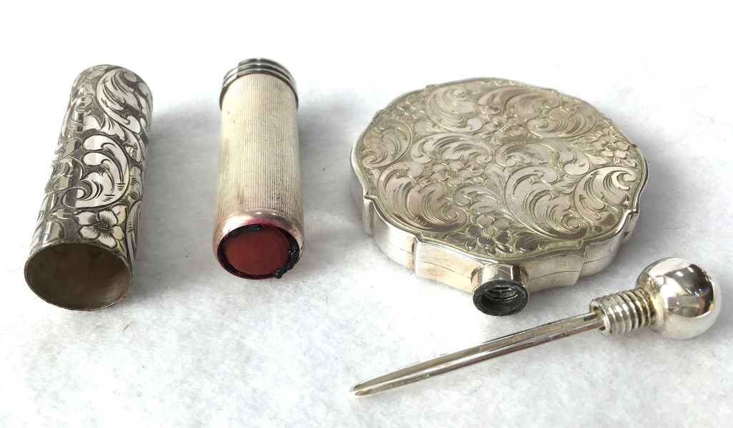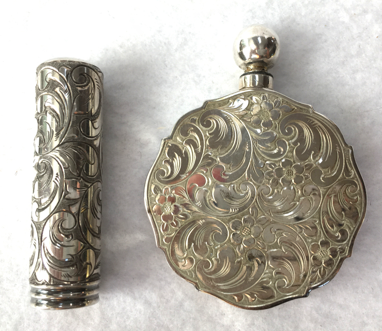 In all my years of collecting, I have never had another matched set like this one. Both pieces are sterling silver with chased flowers and flowing scrollwork in the manner of the Italian sterling compact case makers. However, the only marks on these pieces are for sterling "925" and a strange combination of letters that I cannot make out clearly enough to identify. Both pieces are in pristine condition ... there is still lipstick inside of the lipstick case. Perfume measures 2" diameter not counting cap. Lipstick is 2-1/8" high. It is a beautiful set! (Click on pic for more photos.) |