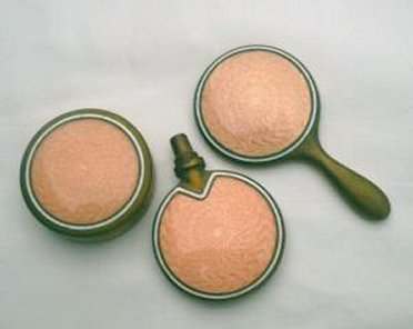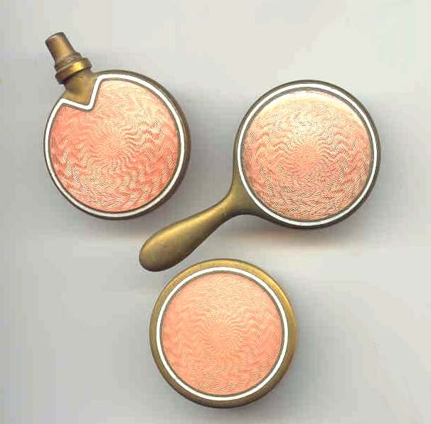 Here we have a really fabulous peach enamel guilloche purse set including a pill box, tiny mirror, and petite perfume. Notice the little white band of enamel around the border for accent ... very pretty! The perfume is enameled on both sides and has a screw-on cap. The tiny mirror is beveled and is just too cute! The pill box lid lifts off free and holds closed tightly. This is just a beautiful little set ... comes with pouch for storing. All pieces measure 1-3/8" diameter not counting cap and handle. (Click on pic for more photos.) |