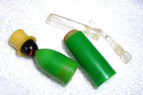 Here we have a very rare catalin purse perfume in a Black Americana theme! The smiling face is topped with a yellow tophat. He has red lips and jeweled eyes (although one jewel is missing ... we will try to find a replacement. The case opens by unscrewing the top portion. Inside is a glass removable perfume bottle with dauber intact. Back of tophat has a 1/4" chip out of edge; other than that and missing eye, piece is perfect. Measures 3-1/4" high. (Click on pic for more photos.) |