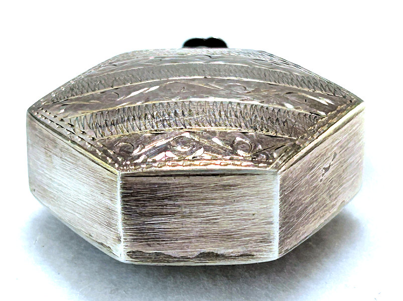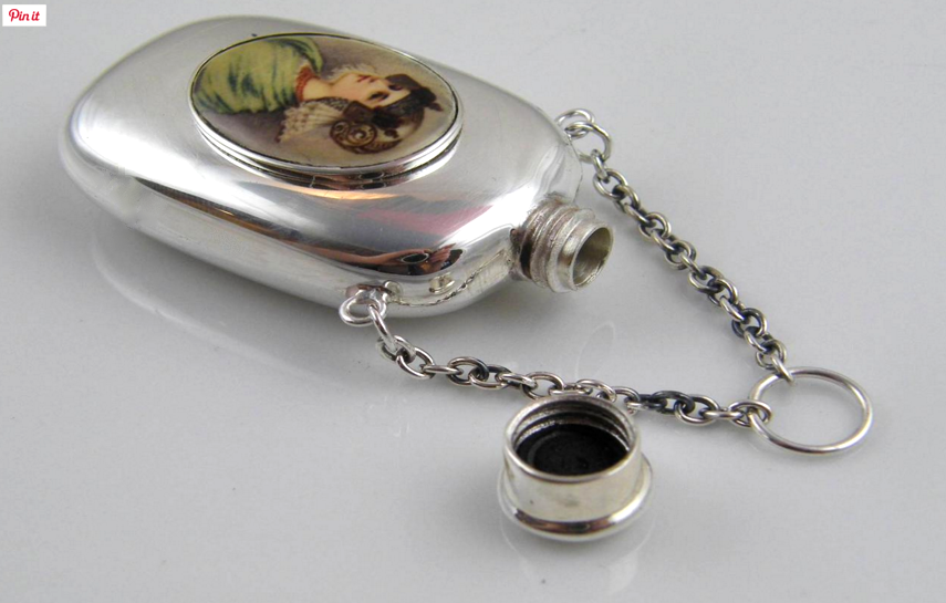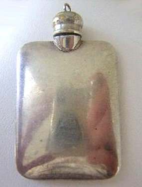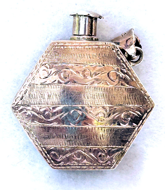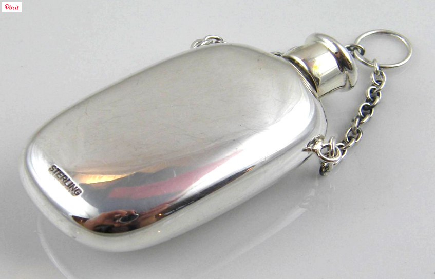 This lovely little sterling silver perfume bottle has dainty chased designs on both front and back. It can be worn as a pendant or from a chatelaine or just tucked in your purse. The little flower shaped cap unscrews and has a long dobber attached for easy application. It is marked "925" on the bail. Such a pretty little perfume bottle and just the right size to tuck into your purse! I can include a sterling silver chain if you wish to have one at no extra charge. Simply mention in the Special Comments section of the shopping cart that you would like the chain and I will include it as a free gift. Measures 1-3/8" across x about 3/8" wide x 1-1/2" high to top of cap. (Click on pic for more photos.) |