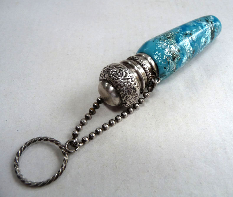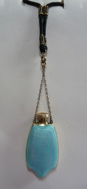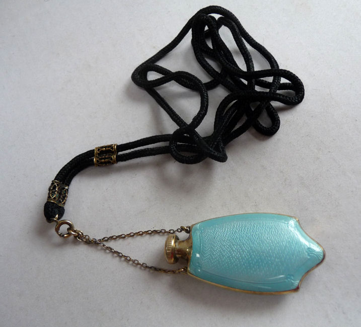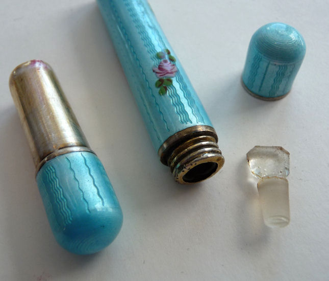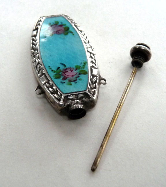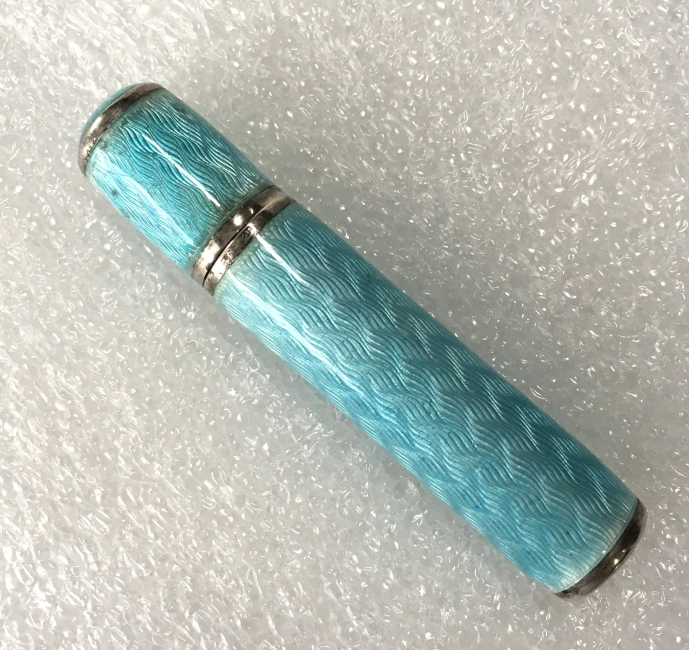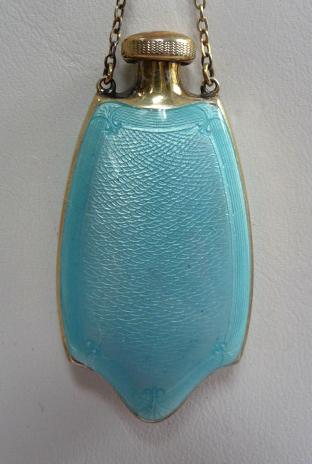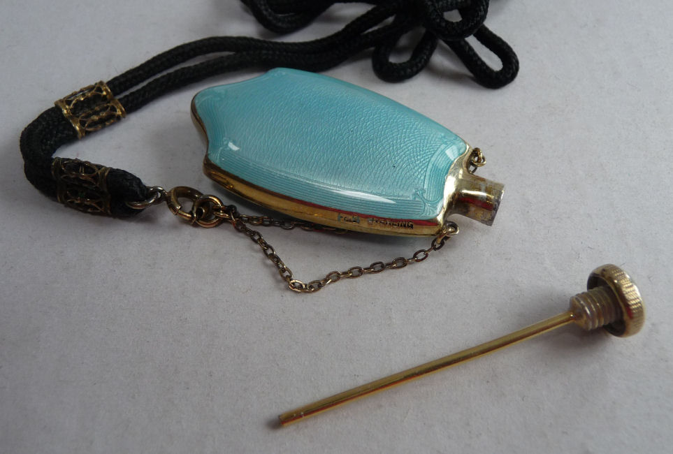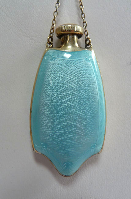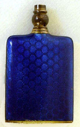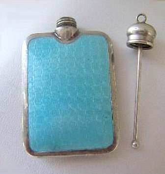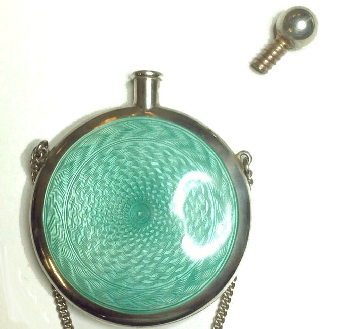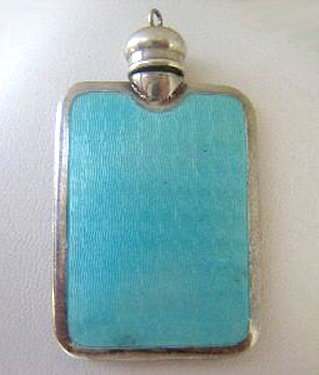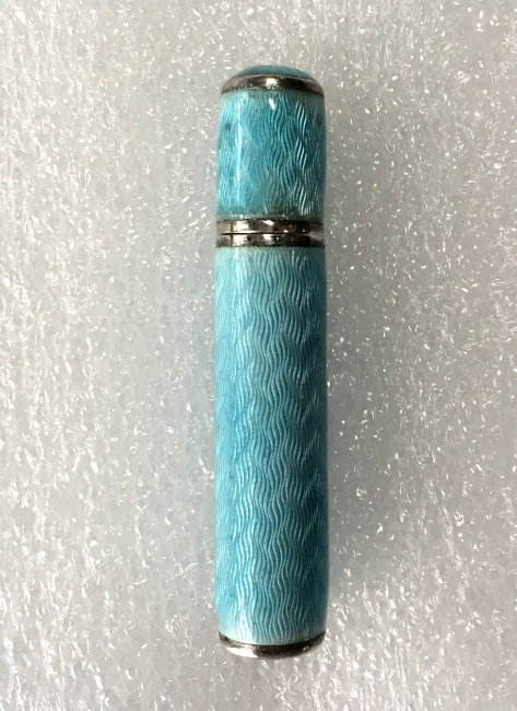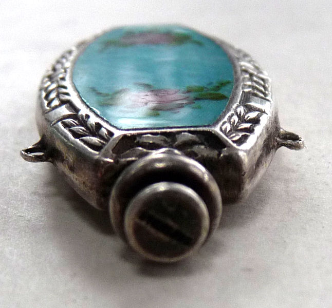 This gorgeous little purse perfume is done in sterling silver and pretty robin's egg blue enamel guilloche. The enameling is in perfect condition and the silver is smooth and undented. The screw-on cap has a little ring attached to the top so this can be attached to a chain and worn as a pendant or attached to a chatelaine. Also, the attached dauber has a tiny ball on the end to carry the perfume ... very sweet! Measures 1-3/4" high x 1-1/8" wide. (Click on pic for more photos.) |