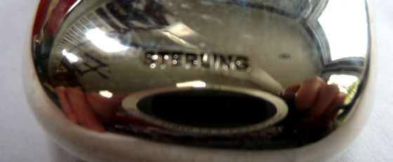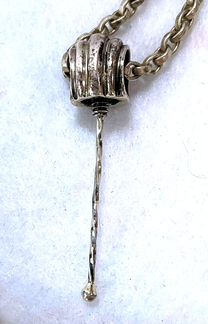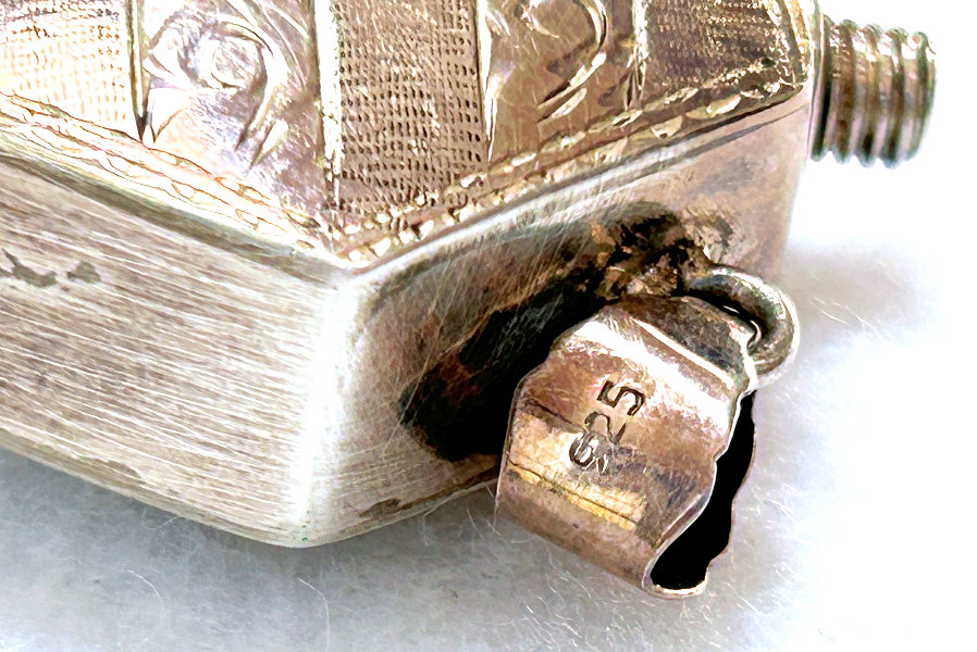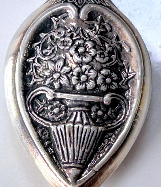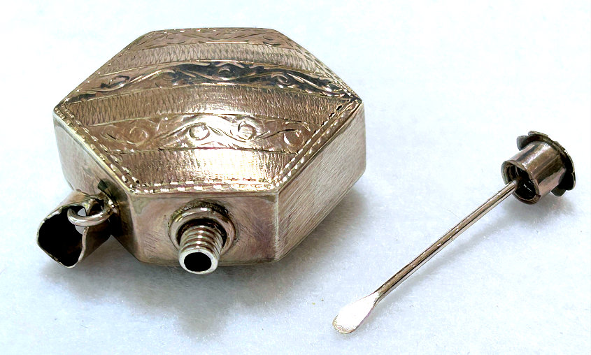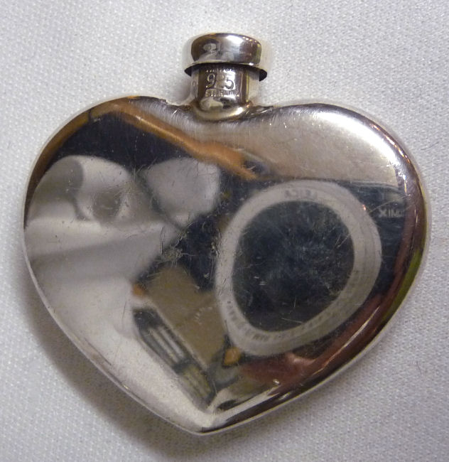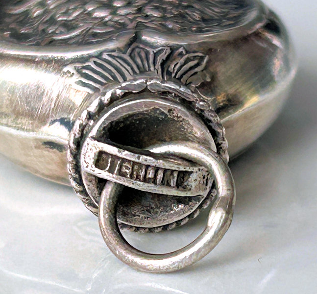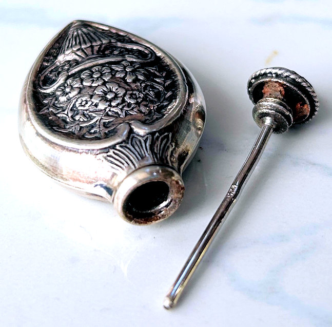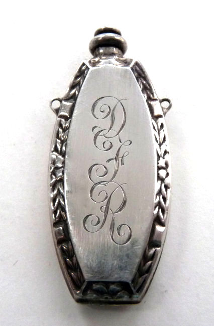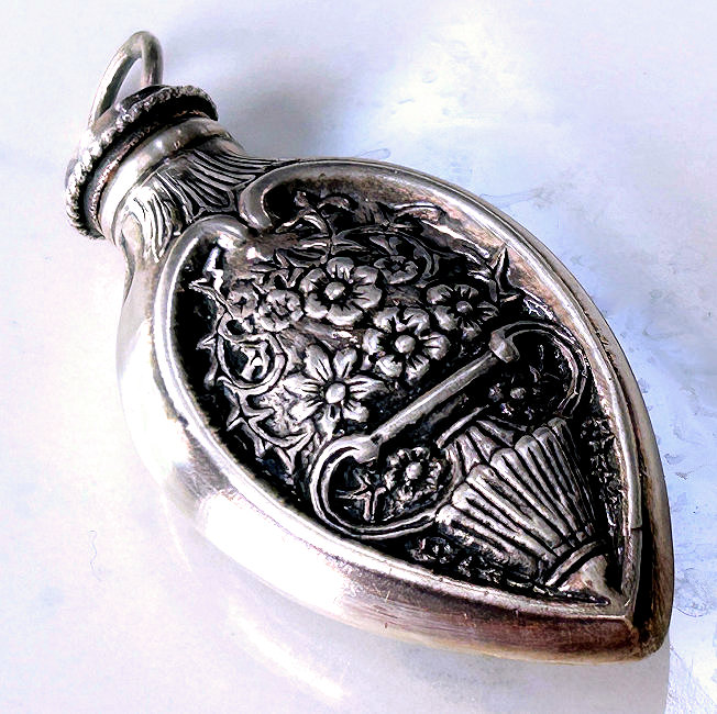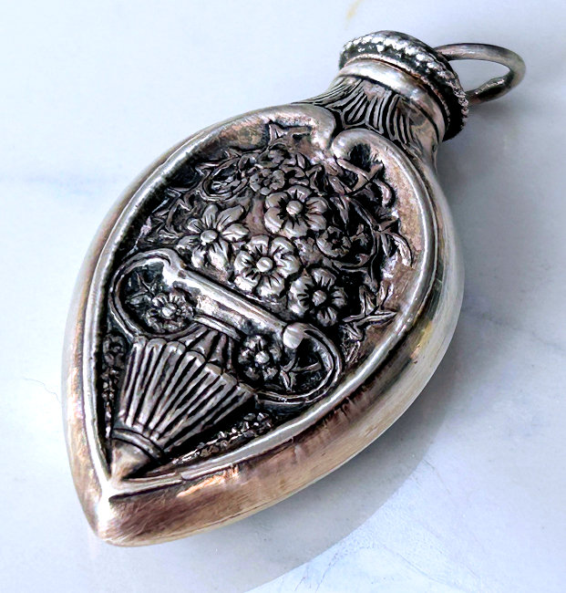 This lovely perfume pendant can be worn as a necklace or attached to a chatelaine. It features a beautiful repoussé urn overflowing with flowers on both sides. The lid unscrews to reveal a long metal dauber with the number 925 on the side to denote sterling silver. It is also marked STERLING on the loop that holds the bail ring. There is no maker's mark that I have been able to find but it is obviously of the best quality. I will include a new sterling silver chain in order to wear with it. Beautiful piece! Measures 1-3/4" high x 1" x 1/2". (Click on pic for more photos.) |