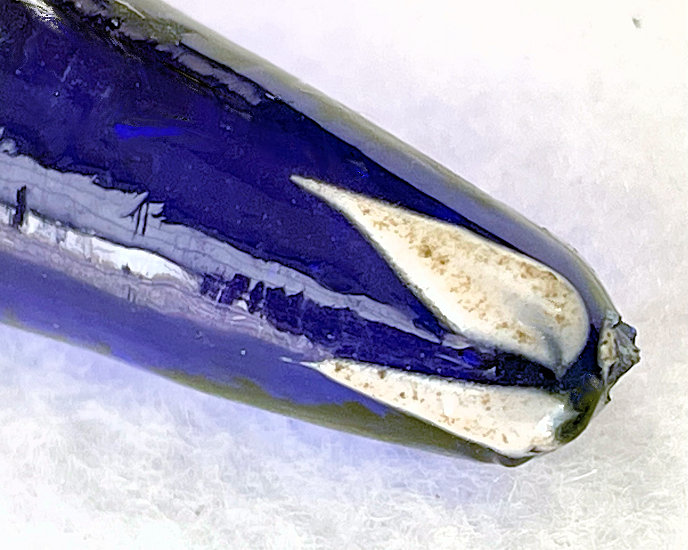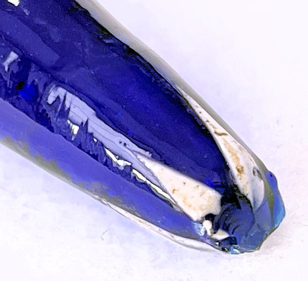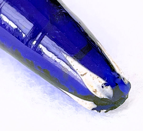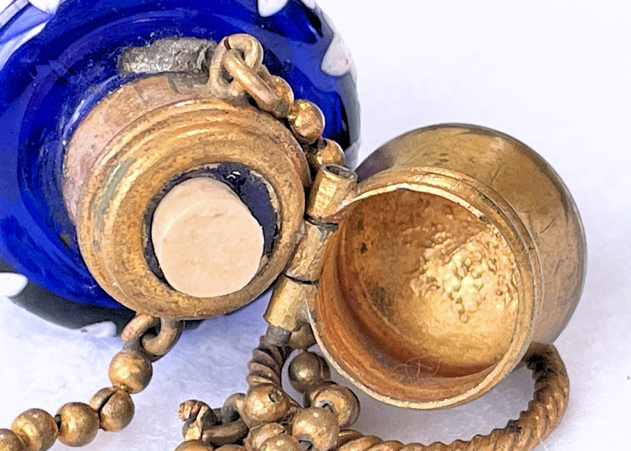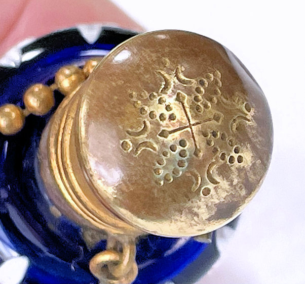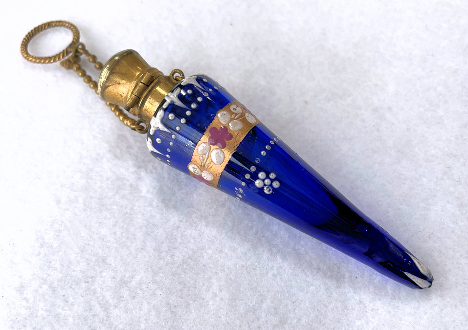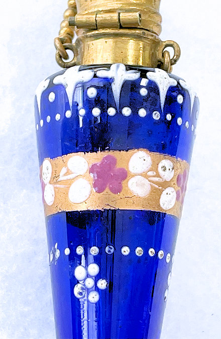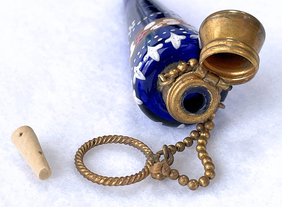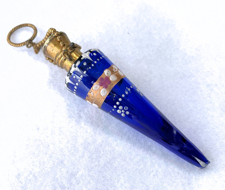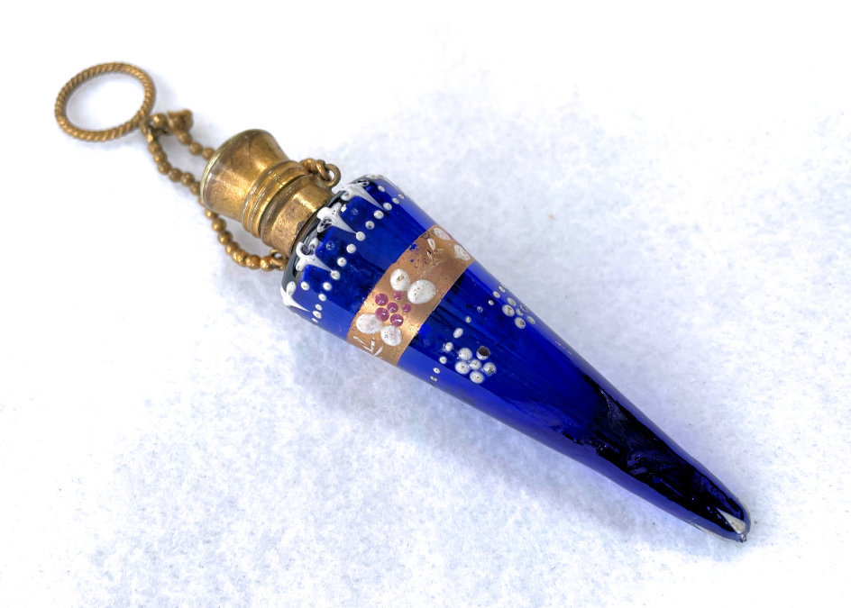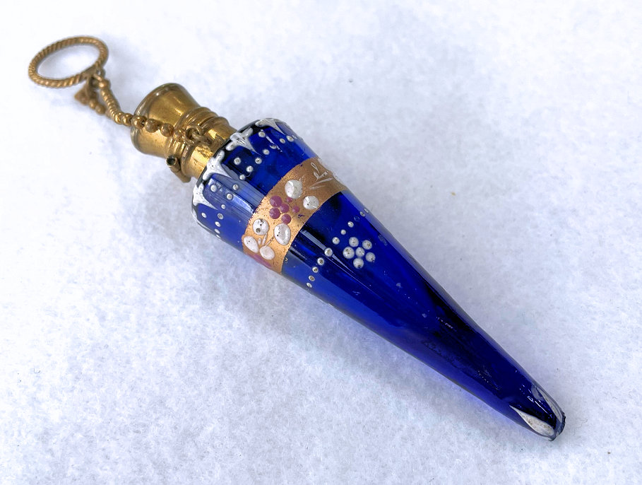 This beautiful antique cobalt glass perfume flacon or scent bottle more than likely originated in Czechoslovakia in the Moser style. It is cobalt glass with gold gilt and enameled designs hand-painted on glass itself. The findings are brass ormolu and the cap has etched designs on it. The tip of the perfume has a rough feel to it like a pontil was broken off which would make it hand blown. Even though it feels a bit rough, I don't believe it is a chip or damage of any kind as the painting goes into it (see close-ups). There is a beaded chain and a twisted finger ring or loop to attach to a chatelaine. The beaded chain broke many years ago and was reattached with very old string which has aged to the same color as the brass. Cap opens to reveal a (newly replaced) cork stopper. Very minor wear to the paint and it is in excellent condition overall for its age. This is a most unusual and highly collectible perfume. Measures 3-5/8" when measured from cap to tip, 5-1/2" long from ring to tip. It is about 1" wide at the widest point.. (Click on pic for more photos.) |