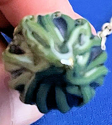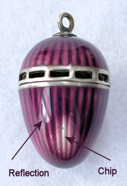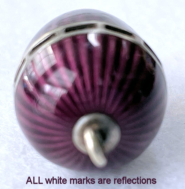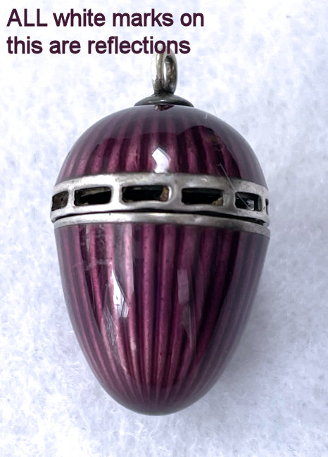 This is a sweet little egg-shaped sterling silver purple plum enamel guilloche pendant vinaigrette hanging ring to wear as a pendant. It unscrews to place perfumed cotton inside. The inside crossbar is marked "STERLING" although it is very hard to read without a loupe. Unfortunately, there is some enamel loss along one side which I believe could be touched up very easily with a matching enamel (possibly nail polish?) or just wear it with that side facing the back. I love the striped design in the enameling ... gives it a different appearance instead of just a solid color. Very pretty! Measures approximately 1" long including ring at top. (Click on pic for more photos.) |