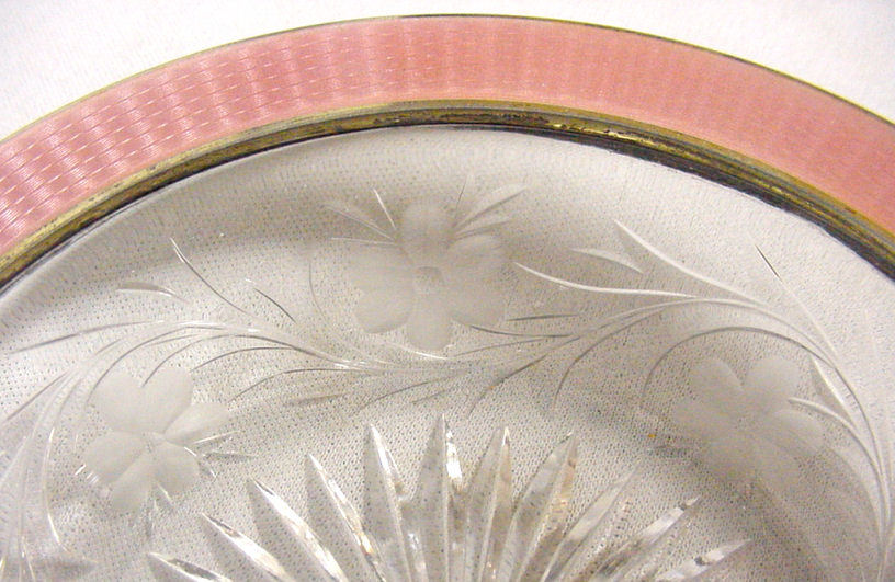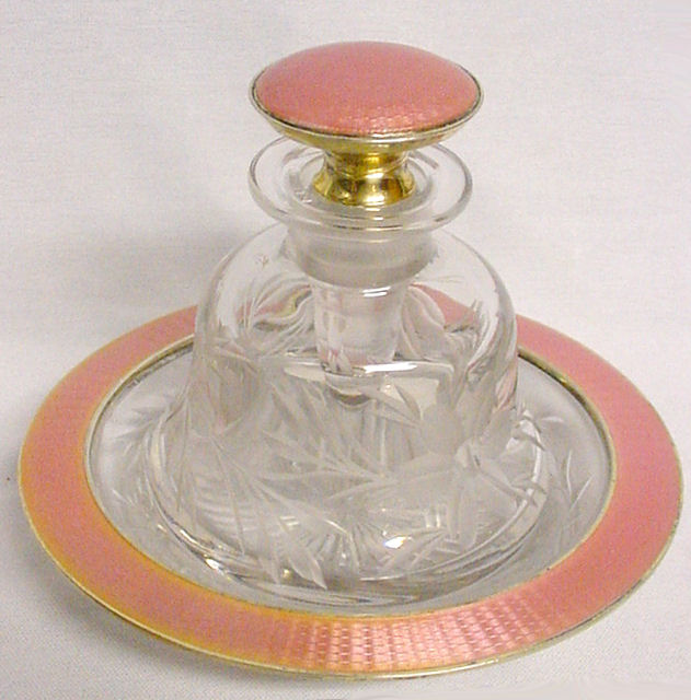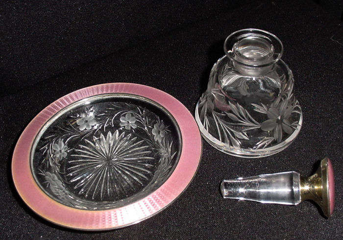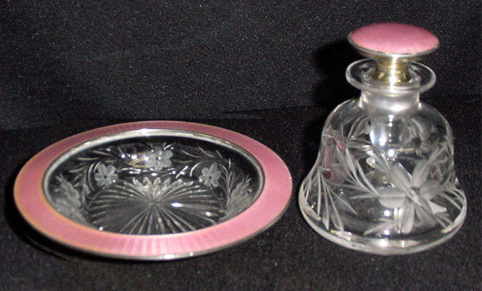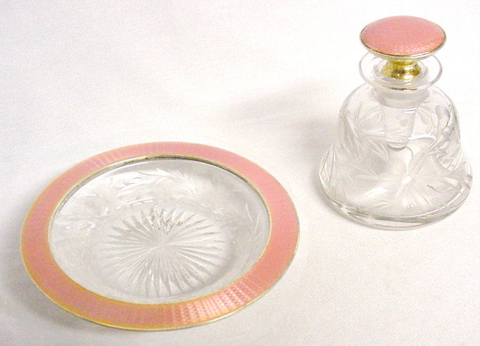 This is an absolutely gorgeous dresser set consisting of a perfume bottle with pink enamel guilloche on sterling silver dauber and a matching dresser dish with the same pink border. The perfume nests into the dish so it can be used as a liner for the perfume or for rings and small jewelry (not an exact fit but close enough to use this way). Both pieces are etched in deep cut flower designs ... and both pieces are in excellent condition. Dish measures 5" diameter x 3/4" deep. Perfume is 3" diameter at base x 3-1/2" high overall. (Click on pic for more photos.) |