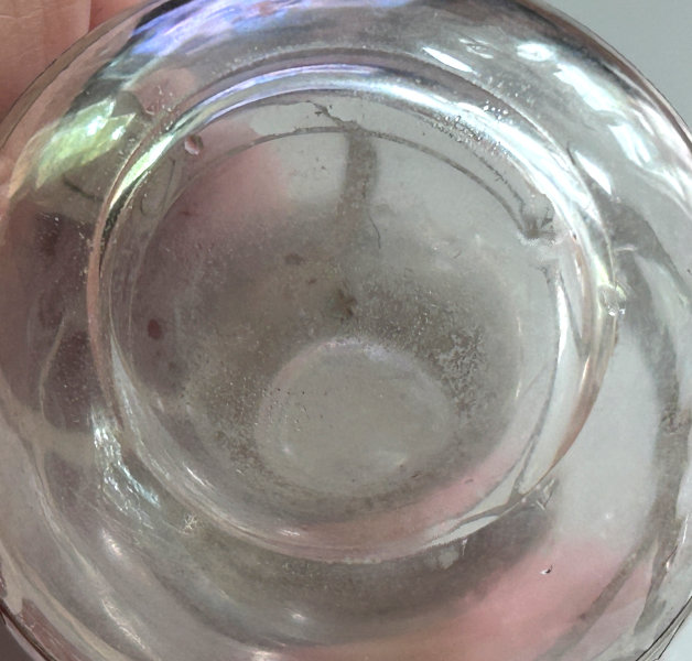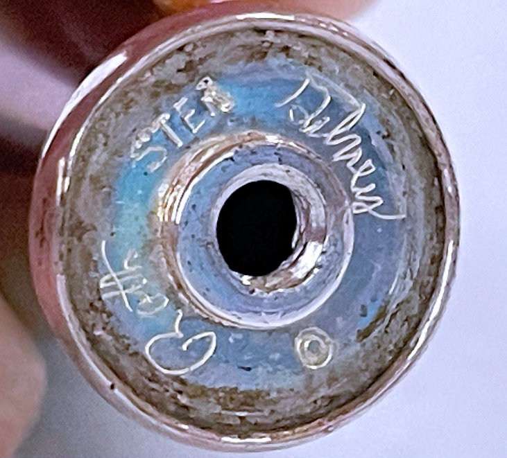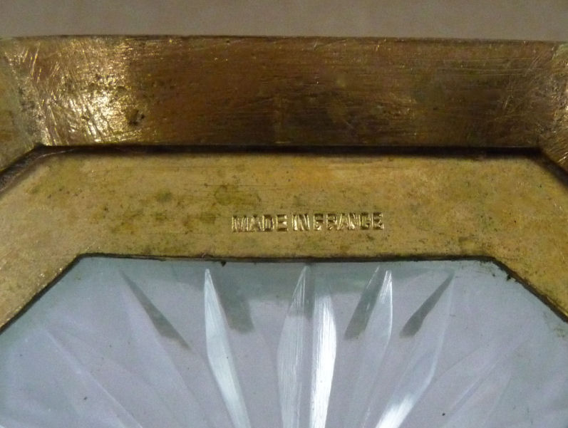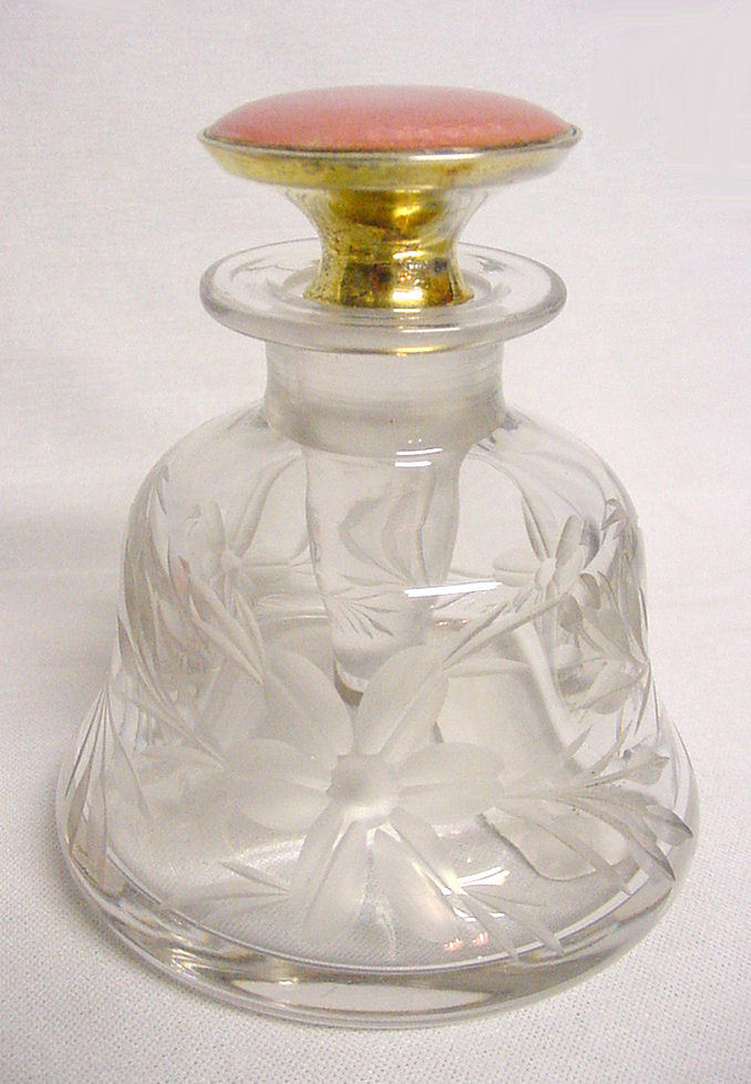 This beautiful little crystal perfume bottle was made right here in the U.S. by G. H. French Co. of Attleboro, Massachusetts (this mark was used in the 1920's and 1930's). The crystal bottle has a polished bottom and a stopper with dauber attached. The most attractive thing about this bottle is the adorable enamel guilloche on sterling silver screw-on cap with hand-painted pink roses. It is just so pretty! The bottle has few apologies, neither of which affects the bottle structurally. There is a sliver of enamel missing right on the edge of the lid which, quite honestly, I didn't even notice till I took the supersized close-ups for this listing. The neck of the bottle has a chip in it but the stopper seats down below that and I have tested it for leaks. It holds perfume perfectly with nary a drip! So it is totally usable should you choose to do that. Or just place it on a shelf and admire it as I have. It's really a beautiful little bottle! Measures just 2-3/4" tall x 3/4" diameter at the base. Note ... I have priced it according to the slight damages mentioned above. (Click on pic for more photos.) |