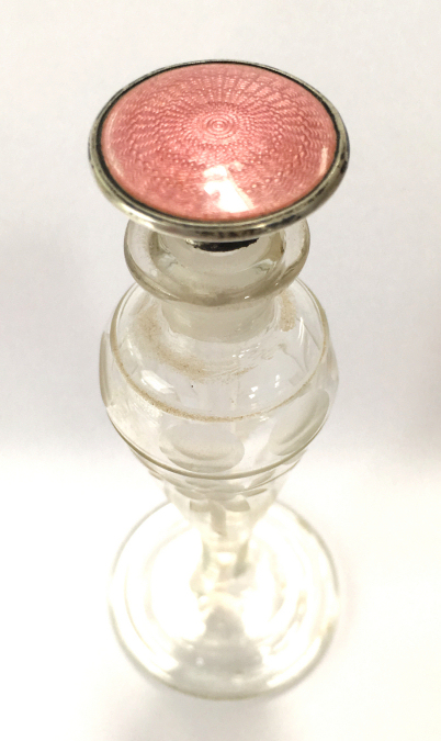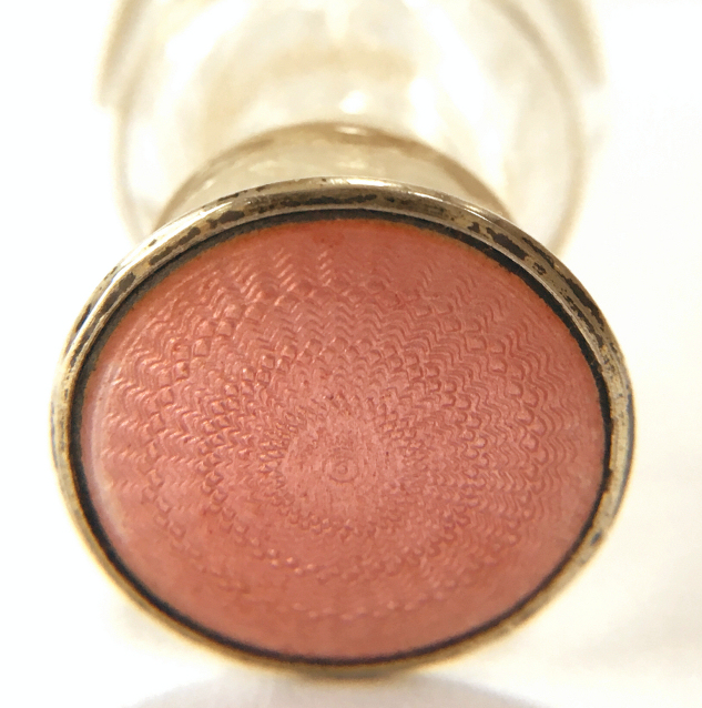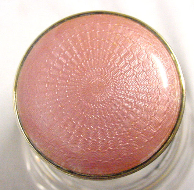 Here is another gorgeous piece by Thomae ... a sweet little perfume bottle with a sterling silver cap with pink enamel guilloche top. The bottle is beautifully etched and has a very pretty shape to it. The dauber is still affixed to the stopper and is in perfect condition as it the rest of the bottle. There are no apologies whatsoever! It is marked "STERLING" and bears the hallmark for Thomae on the sterling neck of the cap. It's a nice smaller size as well that won't overwhelm your vanity ... it measures 3-1/4" tall; the base is 1-1/4" diameter and the cap is just a hair over 3/4" diameter. It is a little treasure! (Click on pic for more photos.) |