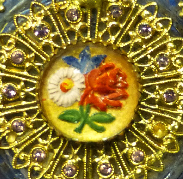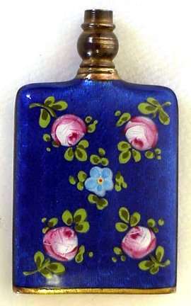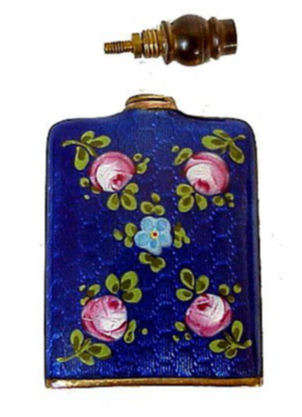 This is one of my favorite purse perfumes from my private collection. I just love the richness of the deep cobalt blue with the subtle designs visible beneath and then the pink roses and blue forget-me-not. It is just so sweet! Rarely do you find enameling on the back, and this one is exquisitely done. It is all in perfect condition. Cap unscrews for easy filling. This is an exceptionally rare piece and one you won't find another like for quite some time! Measures 1-1/8" wide x 2" high. Previously listed for $599. (Click on pic for more photos.) |