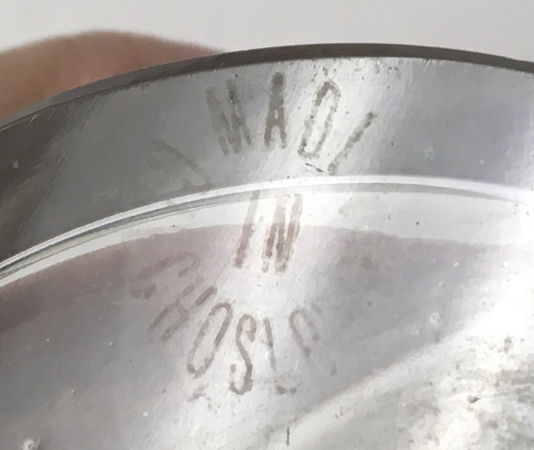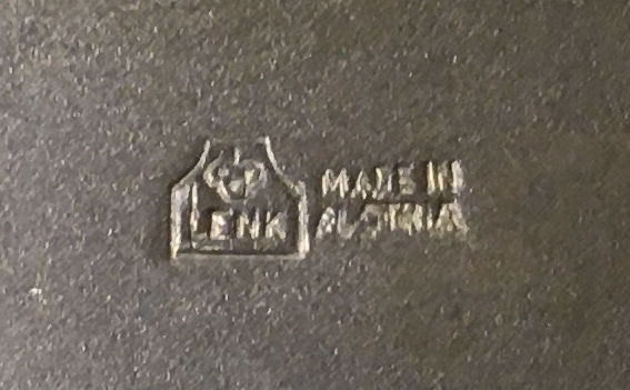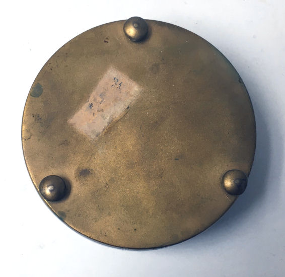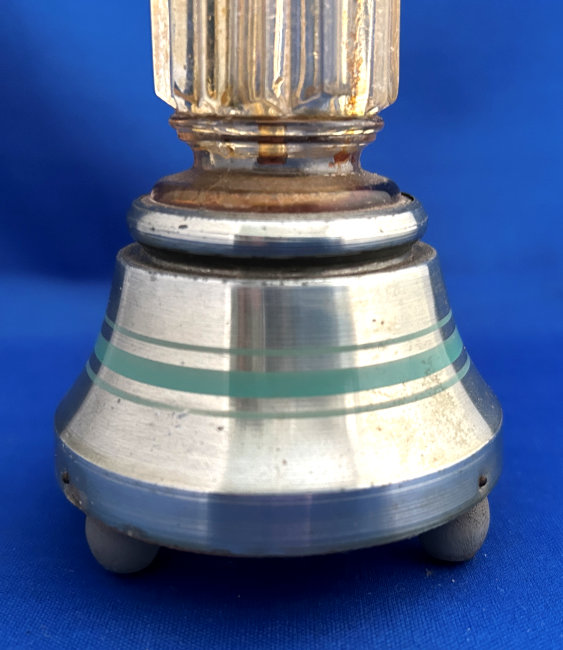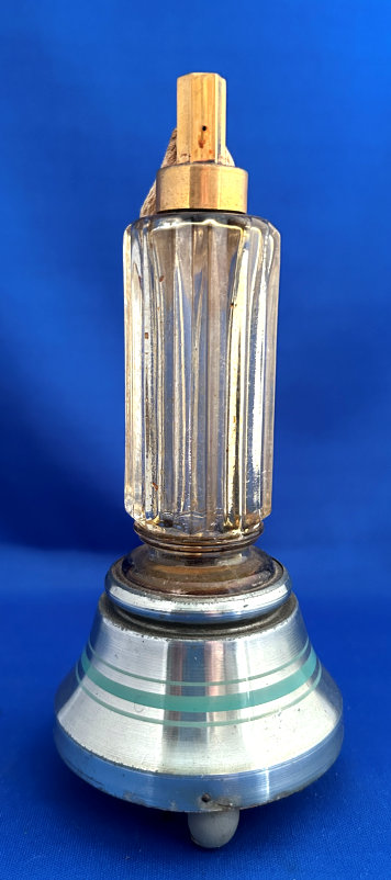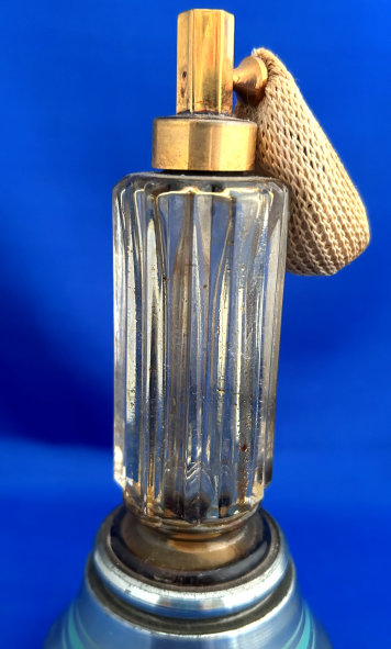 This is a cute little musical art deco atomizer perfume bottle that plays a little tune when it is lifted up. The bottle is glass with brass fittings and an atomizer bulb which, typical for its age, has hardened and crumbled inside so it is not usable in its current state. I believe these atomizer bulbs can be replaced but I prefer to sell it as is as I don't think most people use these and would prefer them to be original for display. The cap does unscrew so it could be used that way. Traces of old perfume still inside and smells pretty darn good! I can't tell if the glass is tinted or if it is the perfume residue inside causing it to have a peach color but I don't want to wash it to find out. The base is aluminum with green accent circles and it has little green wooden feet. I am not sure what tune this is playing but you can hear it by clicking here. The bottle measures about 6-3/4" tall overall and the base is 3" diameter. The bottle itself measures 4-1/2" tall. (Click on pic for more photos.) |