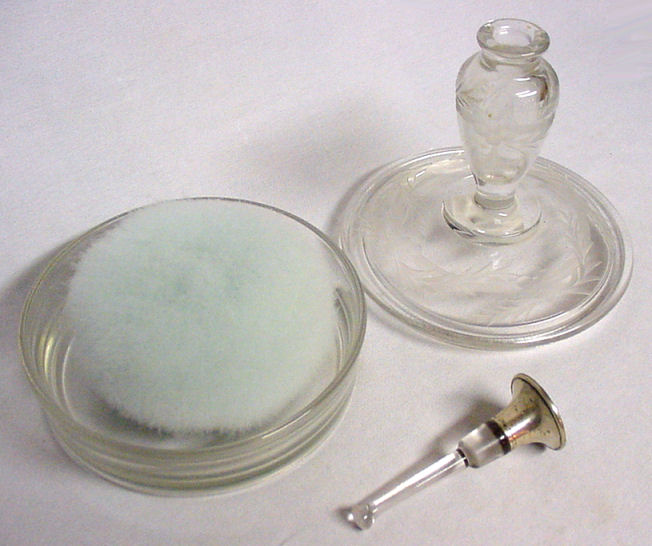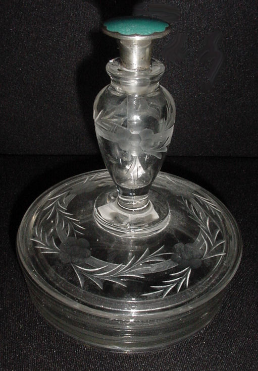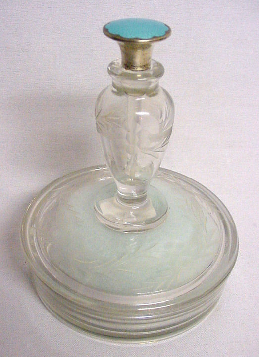 This beautiful combination perfume/powder jar was probably made by Fostoria as the design is consistent with their work. Etched designs in lid and perfume ... top of stopper is blue enamel guilloche on sterling silver ... there is a tiny sliver of enamel missing near one of the scalloped edges (visible in pic above) ... other than that, the set is in great condition. Comes with large pale blue swansdown puff. Measures 4-1/2" diameter x 5-5/8" tall overall. (Click on pic for more photos.) |