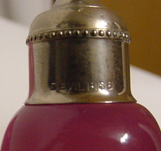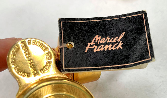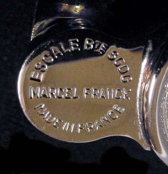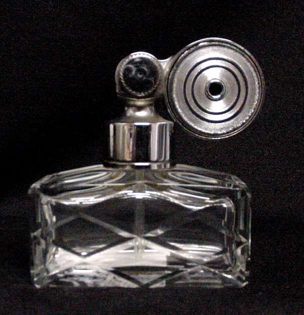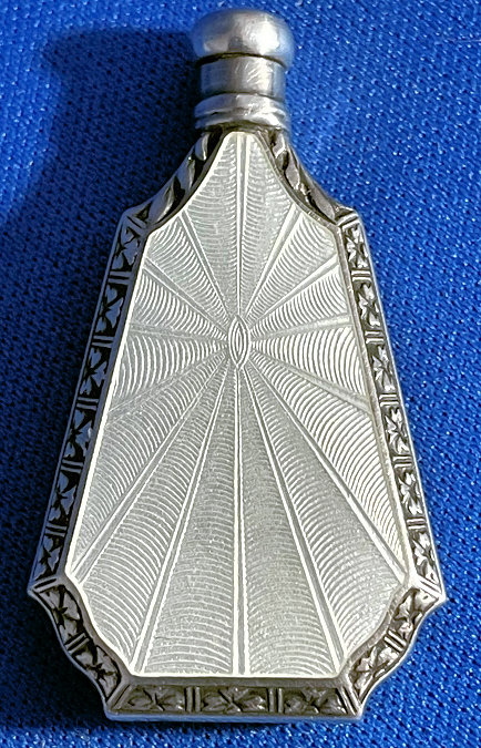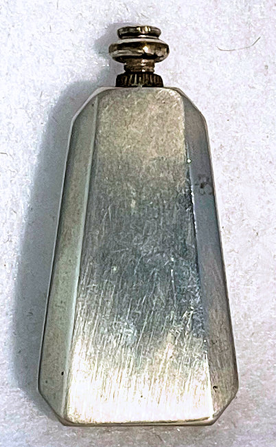 This is a superb art deco design perfume atomizer made in France by Marcel Franck. The atomizer is done in shiny silver metal (possibly chrome) with high polish and concentric ring design with Marcel Franck insignia on the back. Diamond cross-cut designs are on the sides of the bottle. Polished base bears the acid etched Marcel Franck seal. This design was patented in the U.S. in 1937. Excellent condition. Measures 2-3/4" X 1-1/4" X 3-1/8" high. (Click on pic for more photos.) |