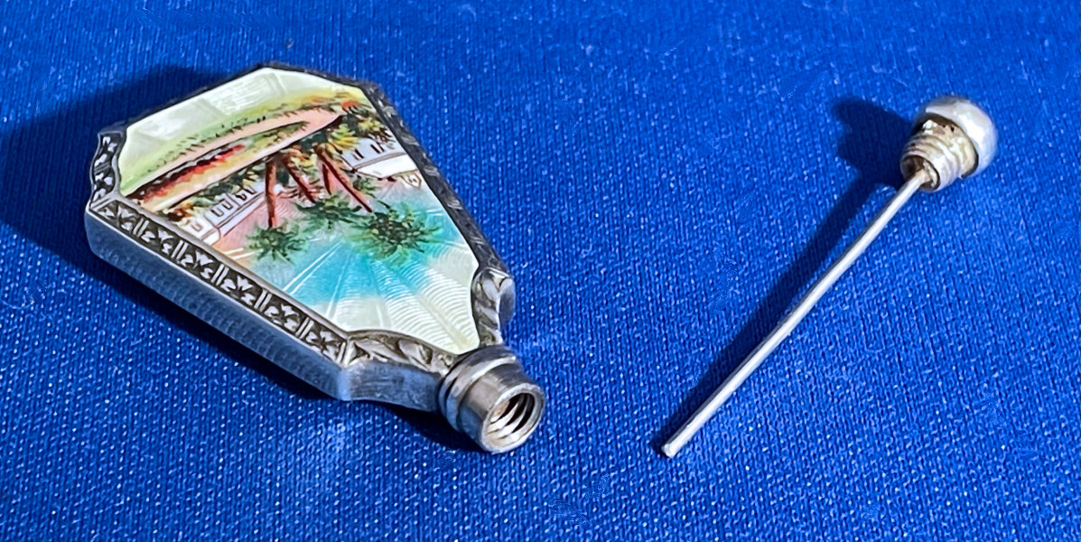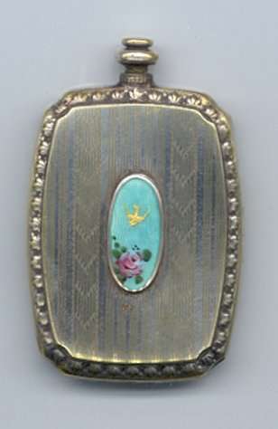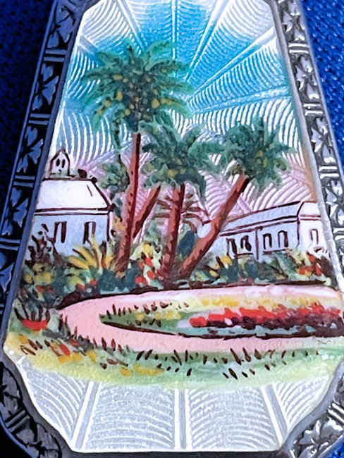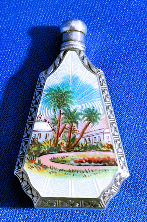 This is an extremely rare and gorgeous little purse perfume featuring a hand-painted scene of a mansion in a tropical setting with palm tres and a courtyard in the foreground. I have never seen another even remotely close to this one ... it is just stunning! Done on sterling silver, the front and back are both in guilloche enamel. While the front has the hand-painted scene with several different guilloche patterns showing through, the back is done in solid whitein a radiating spider web design. Overall the enameling is in perfect condition and the silver is smooth and undented with the exception of a teeny little one on the bottom edge. Embossed designs surround the guilloche on both sides. The screw-on cap has a dauber attached for applying the perfume. Measures 1-5/8" high x 1" wide. (Click on pic for more photos.) |
