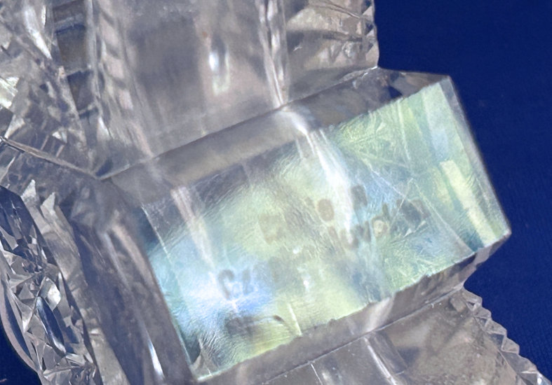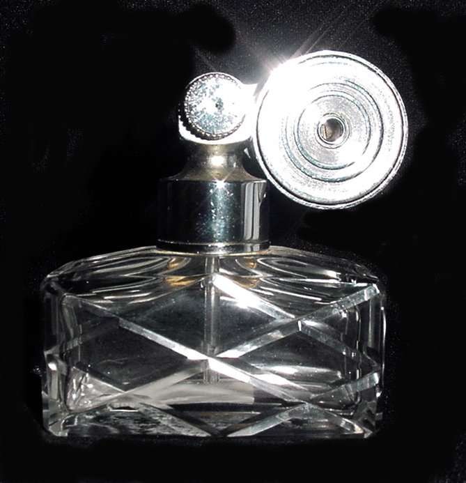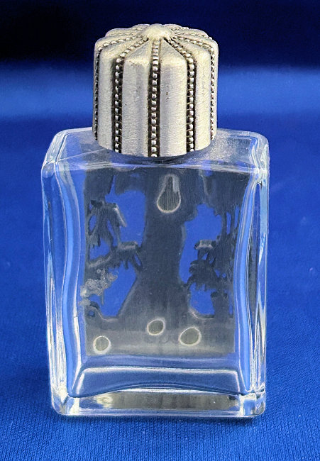 Here we have a beautiful cut crystal zipper design perfume with sterling silver repousse' lid. Lid snaps closed tightly and has a tiny ring to attach to a chatelaine. There is also a tiny ground glass stopper inside to seal the perfume. Beautiful piece! Measures just a bit over 4" long. (Click on pic for more photos.) |