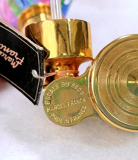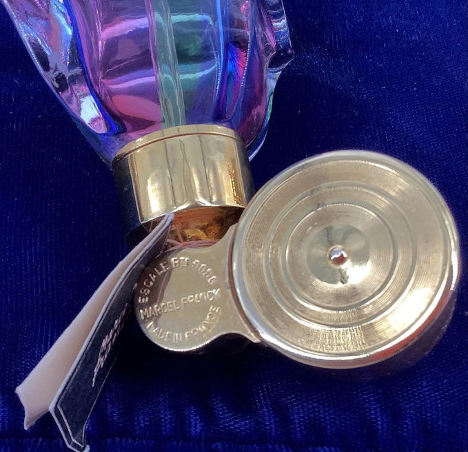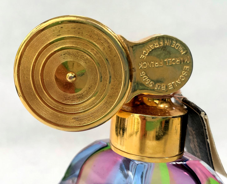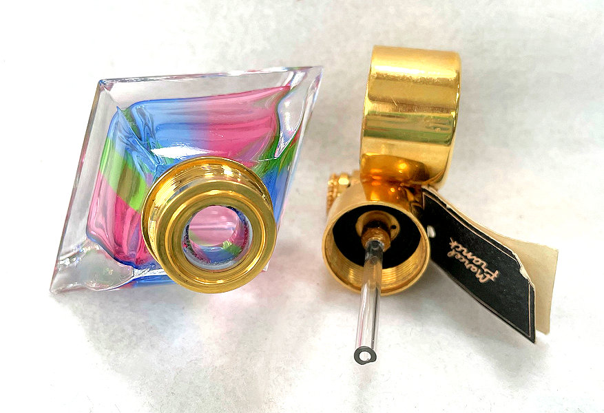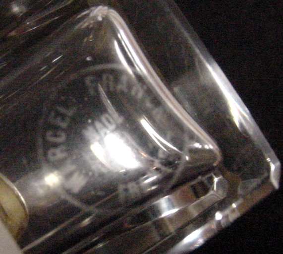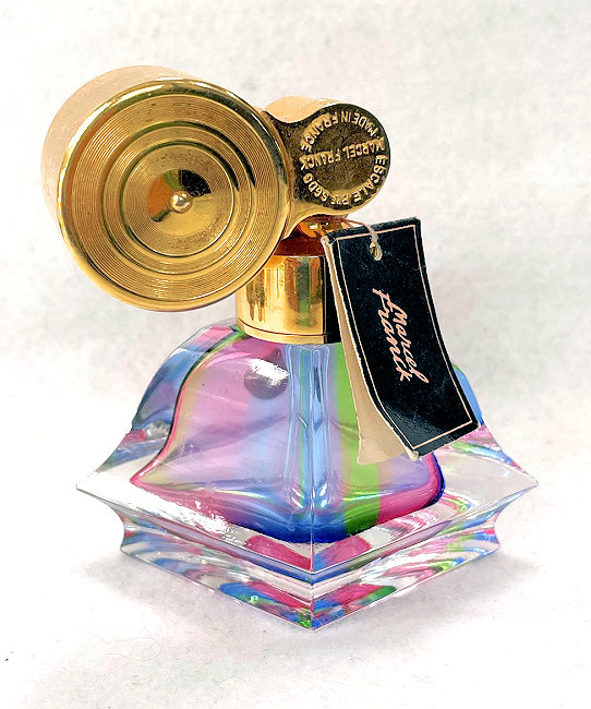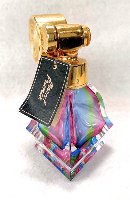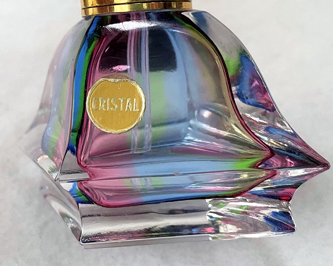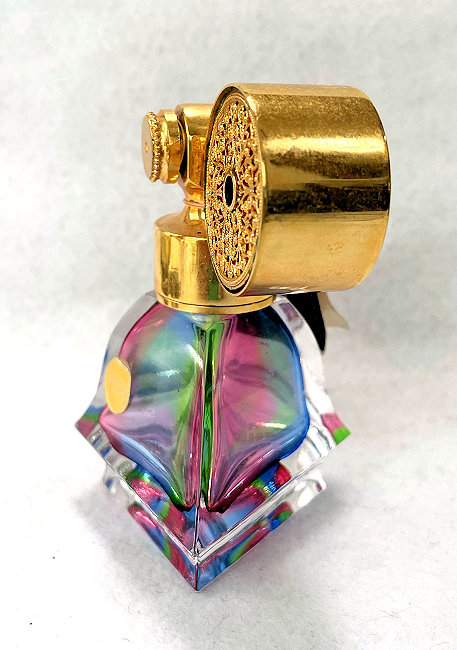 This gorgeous vintage perfume atomizer is done in a rainbow crystal glass with a pedestal base and was made by Marcel Franck of Paris. Based on the design of the filigreed atomizer on this bottle, it was made anywhere from the 1920's to the 1960's*. The bottle retains its original paper label reading Marcel Franck and a sticker on the glass that reads Cristal. It is in excellent shape with no chips or cracks or damage of any kind. There is some residue around the filigreed atomizer where you push it in and I have not tried to clean it because I can feel air coming out so I know it works. There is no residue inside the bottle or the glass tube at all; it is very clean. Bottom is polished. This is a gorgeous bottle that will really stand out in a collection! It is in mint condition and measures approximately 3" across x 2-1/4" wide x 3-1/4" high. *Click here to read about Marcel Franck. (Click on pic for more photos.) |
