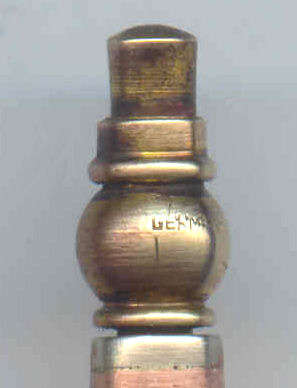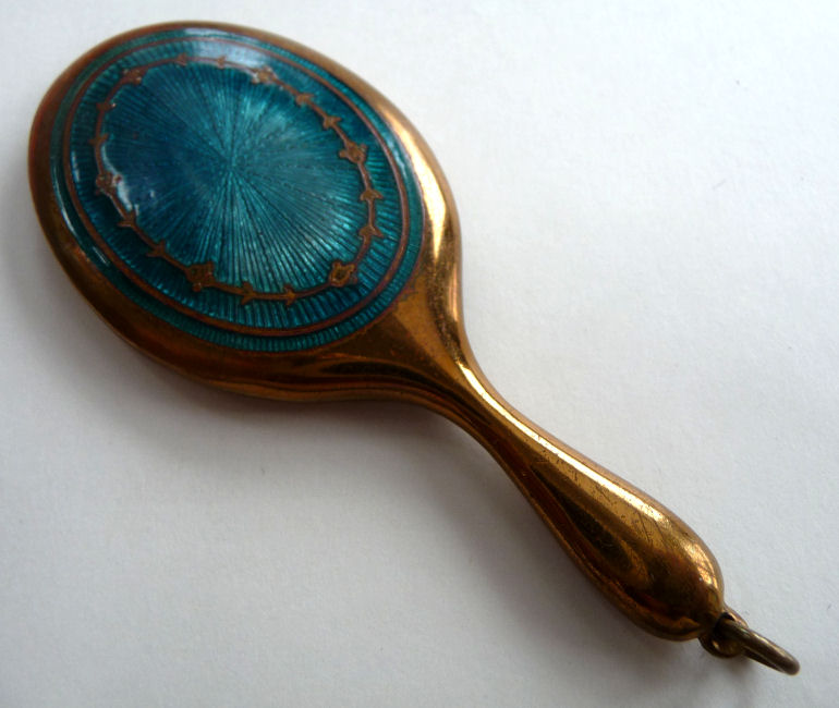 Here is a lovely little peach enamel guilloche mini purse perfume with a unique push-button dauber. The cap unscrews for easy filling. Base metal appears to be brass or copper. Signed "Germany" on the round portion of cap. Measures 2-1/8" tall x 1-1/8" wide. (Click on pic for more photos.) |