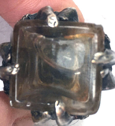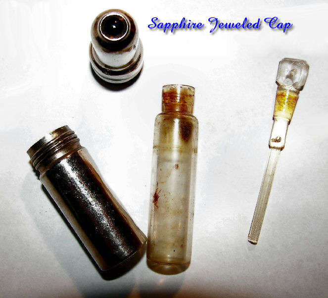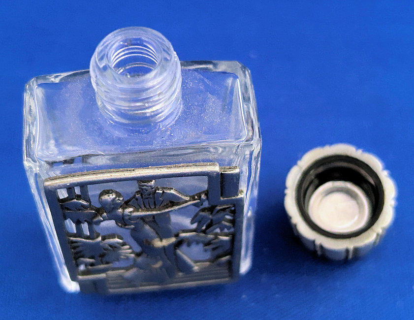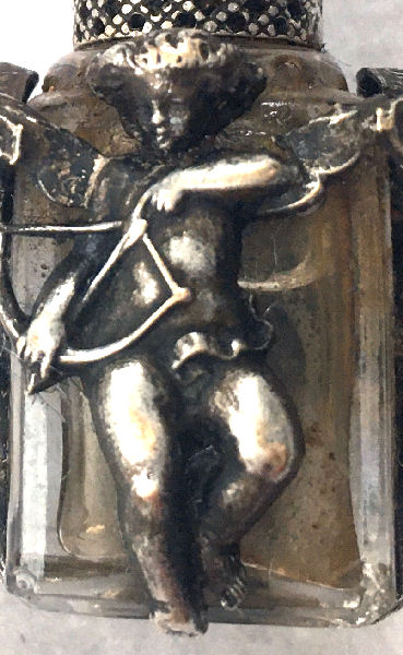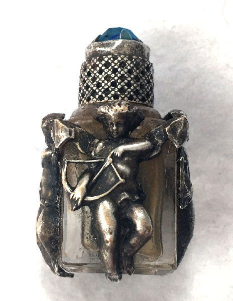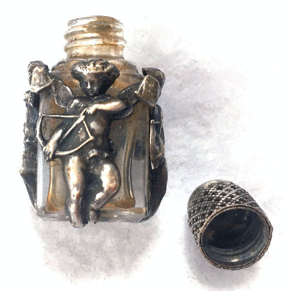I have never seen another perfume bottle this tiny with this much detail! The bottle itself is a scant 7/8" high and is made of glass but has an overlay of four full-bodied Cupids with bows drawn and ready on each side. The cap adds another 5/8" to the overall height of 1-1/2" and is set with a bright sapphire jewel in the top. There are no markings that I can find on the piece and there are still traces of perfume inside. It could use a better cleaning but I will leave that to the next owner. I have polished it just enough to show the detail. The bottle is 5/8" square and with the cupids it is 7/8" square. It's a really gorgeous little piece and could be used in your purse today. (Click on pic for more photos.) |