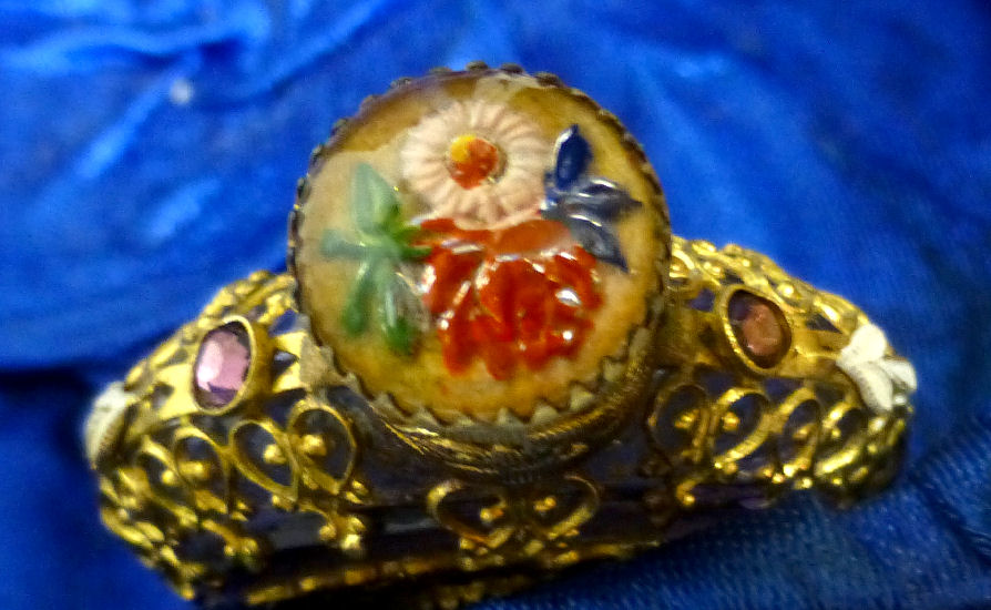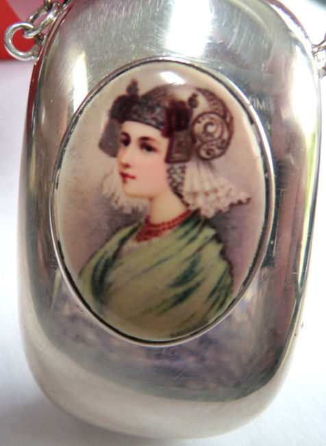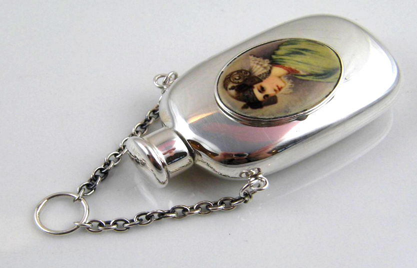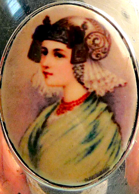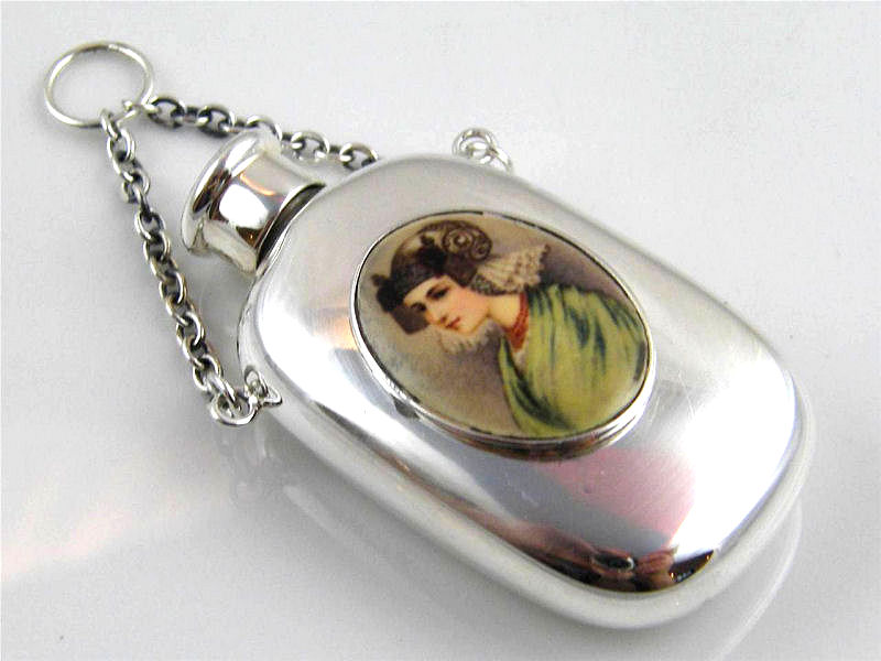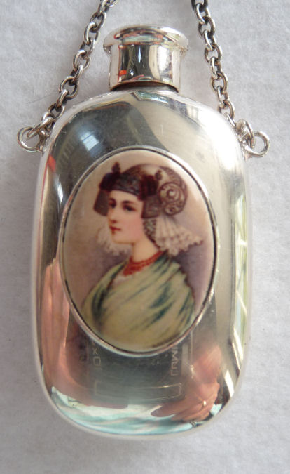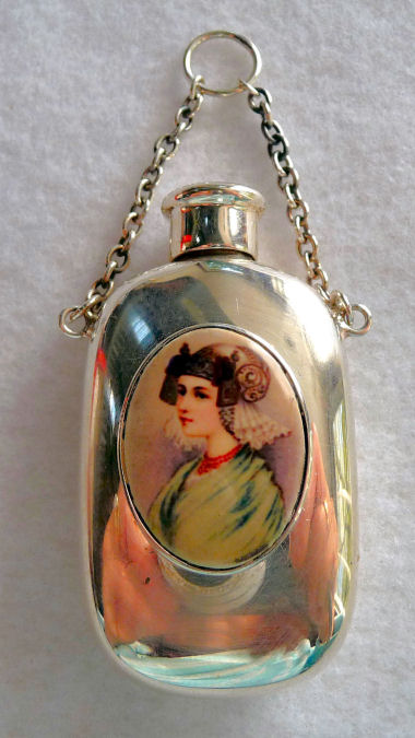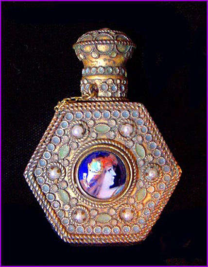 This is an absolutely stunning French jeweled perfume bottle with a raised hand-painted enamel portrait in the center vignette. The portrait of the lovely lady with flowing auburn locks is accentuated with an iridescent flower in her hair that appears to be either a tiny piece of abalone shell or butterfly wing. It is too small for me to be sure, but it is quite beautiful and is inset into the painting. The fancy filigreed bottle is embellished with enameling in the leaves of the seed pearl jewels. Sides of the bottle are embossed in a fancy design and there is a seed pearl at the bottom and in the top of the cap. Tiny chain attaches the top to the bottle to keep it from getting lost. No stopper inside but it more than likely had a cork stopper. I believe I have a replacement that will work and I will include it. Just a gorgeous piece! Marked "Made in France" on neck of bottle. Measures 1-3/4" wide x 2-1/2" high x 3/4" thick counting raised portrait. (Click on pic for more photos.) |
