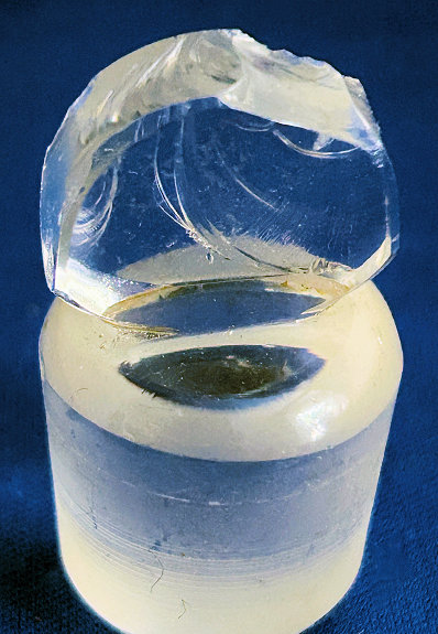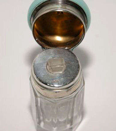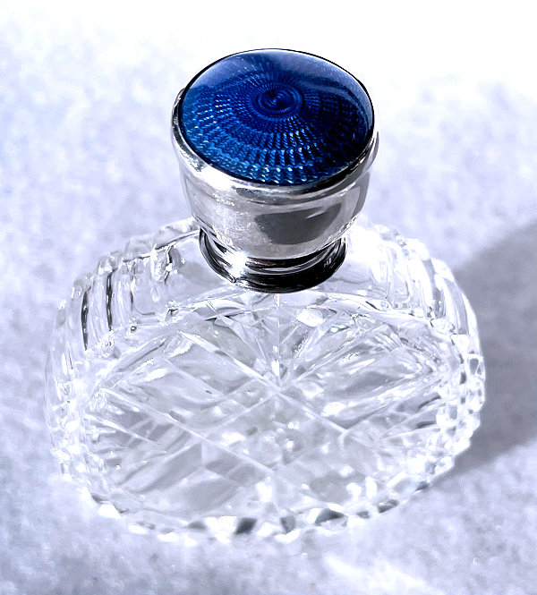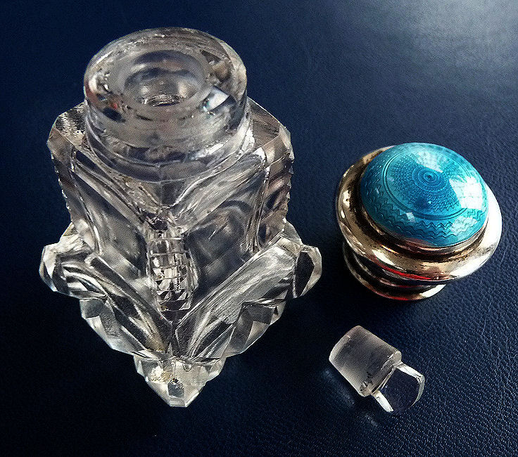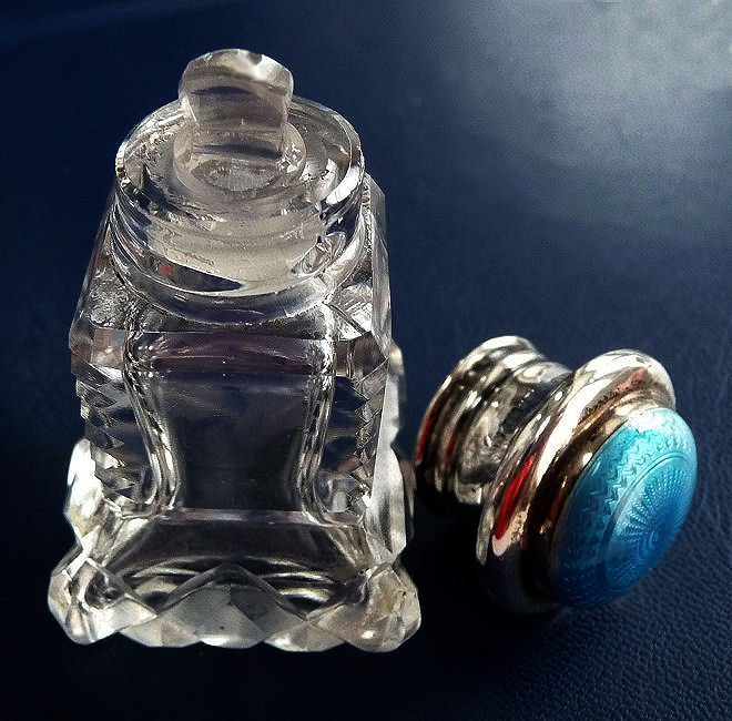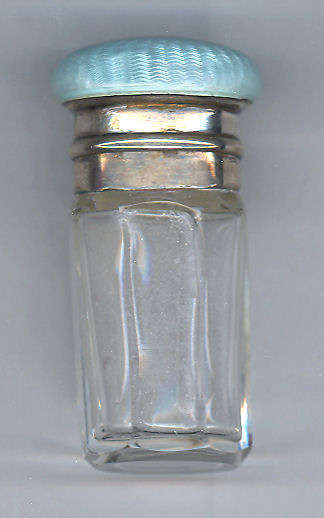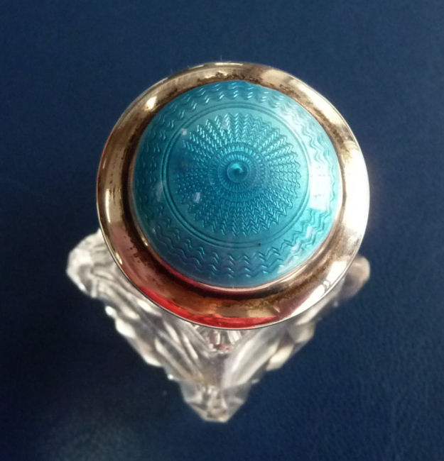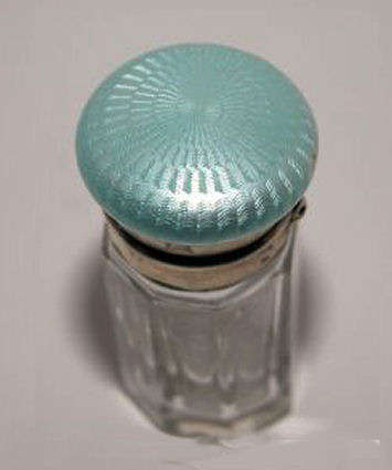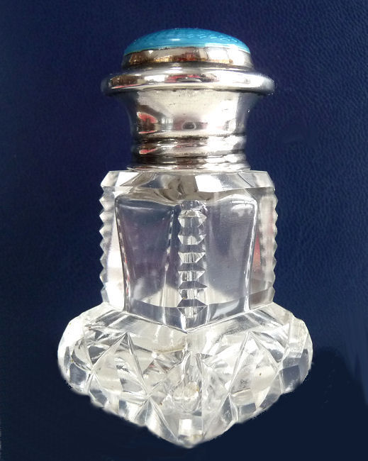 Cute little crystal octagon shaped perfume with polished sides and bottom. Top is sterling silver (stamped 935) with pretty aqua enamel guilloche rolled mushroom shape. There is a little glass stopper inside the lid which snaps tightly closed. Excellent condition with exception of two very minuscule teeny flecks on back of enamel on underside of top. Measures just 2-1/4" high x 7/8" wide ... cap is 1-1/8" wide. (Click on pic for more photos.) |