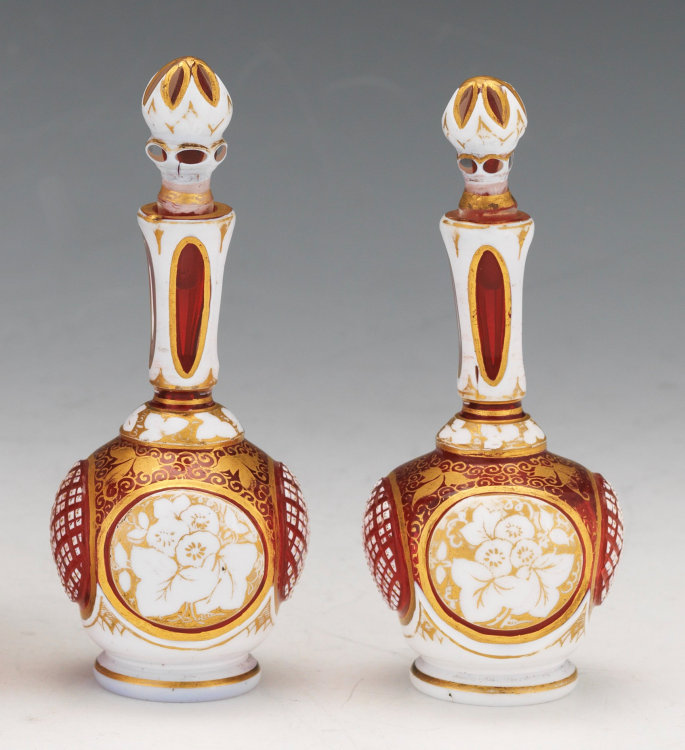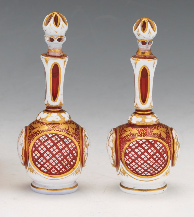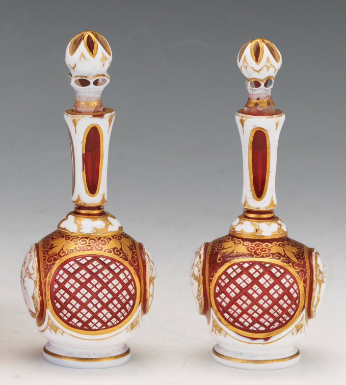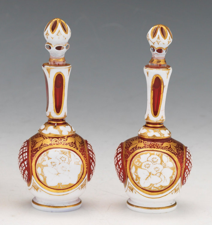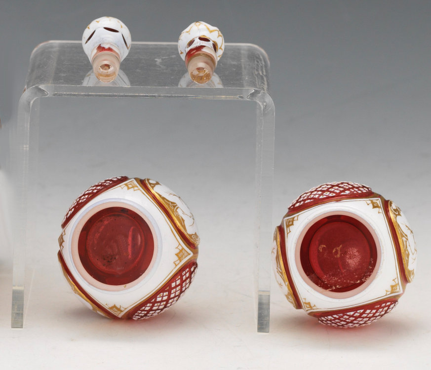 Here is a gorgeous pair of Bohemian cranberry glass perfume bottles with gold gilt decoration. I believe the perfumes were originally cased in white and then cut back to the cranberry as all of the white portions are raised up giving the cross-hatched sections beveled sides. Each little white square has a gold gilt dot on it! The tops are beautifully done as well with the cranberry glass deep inside and the white cut away to reveal it; yet the daubers are clear! Amazing! These are also embellished with gold gilt. The tops of the bottles are slightly different, probably to differentiate between perfume and cologne. Condition is excellent on both with very minor wear to some of the gilt. One of the top rims on one of the perfume bottles has a dip in the edge that is factory made as it is finished over it. Measure 5-1/4" overall. (Click on pic for more photos.) NOTE: There is a jewelry casket that matches these quite nicely on the Dresser Boxes page. |