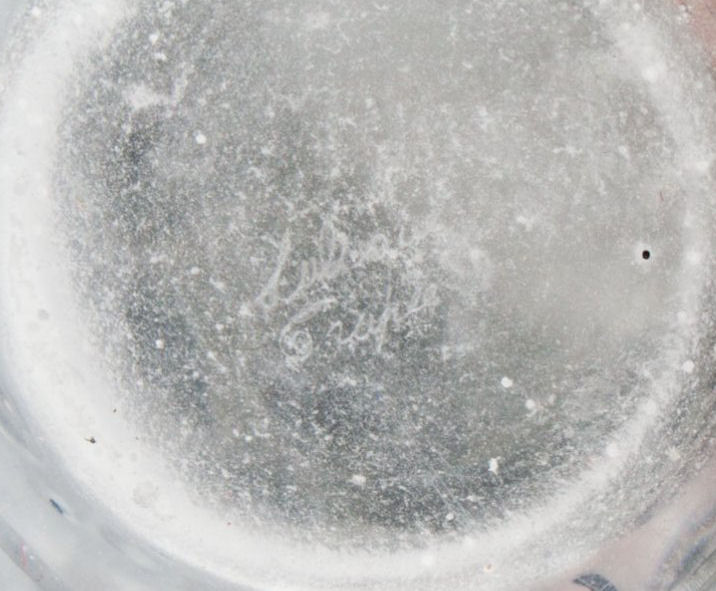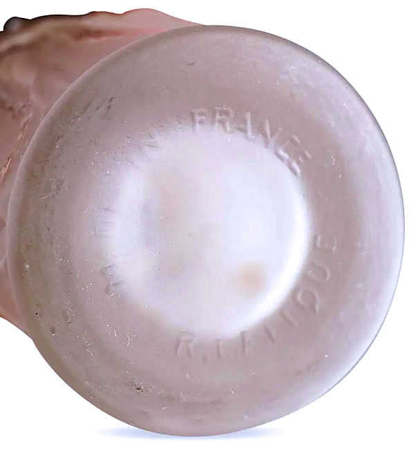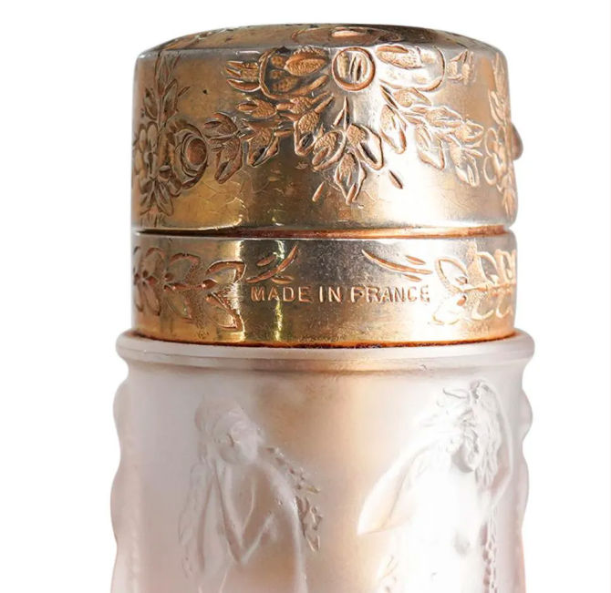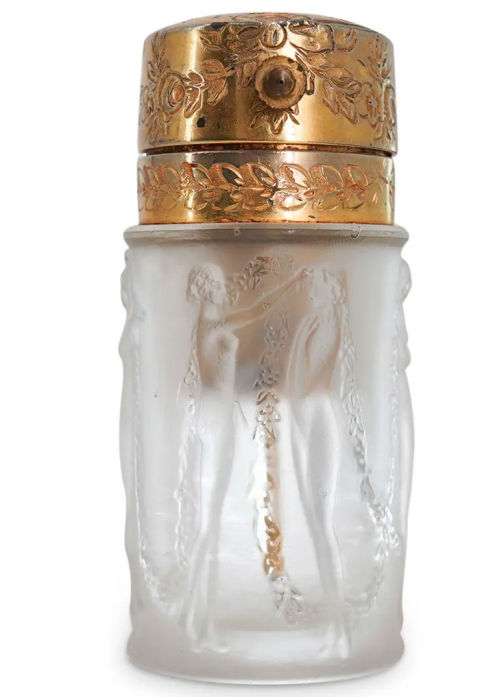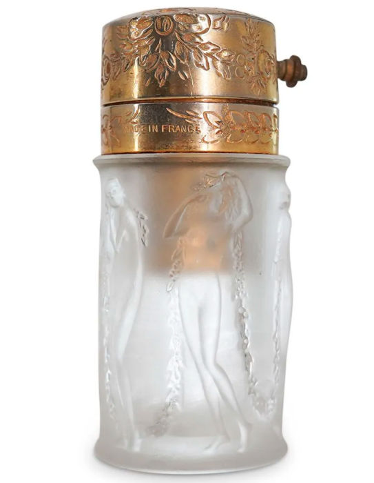 This is a beautiful frosted glass figural perfume atomizer made by René Lalique. It features raised nude female figures trailing garlands around a bottle with a decorated gold gilt metal pump mechanism on the top. The pump is frozen and does not work, but the glass is in beautiful condition and displays well. It was designed and made in France around 1923 making it over 100 years old. It is embossed on the bottom "Made in France" and "R. Lalique". The gold rim is also marked "Made in France". Measures 3-5/8" tall x 1-5/8" diameter. Note: Price is based on pump not working. (Click on pic for more photos.) |