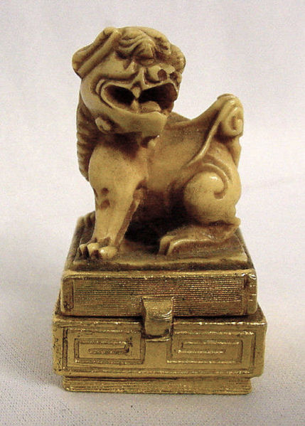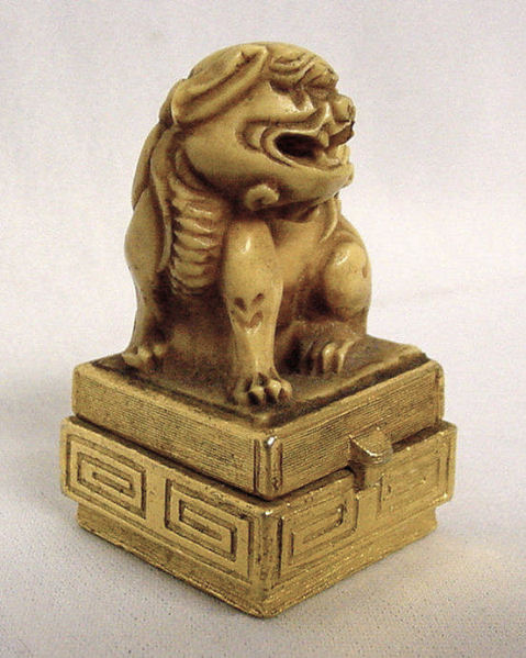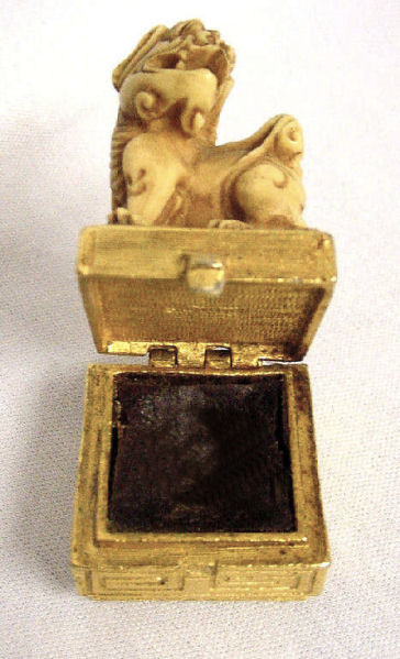 This Estee Lauder Solid Perfume was made in 1974 and is from the Ivory Series. This one is called the "Imperial Foo Dog" and originally held either Youth Dew or Azuree solid perfume. There is still Youth Dew inside this one. The goldtone square base has a lower rim decorated with a Greek key design all the way around. Original label still on bottom. Piece is in great shape with lovely patina. Measures approximately 1" square x 2" high overall. (Click on pic for more photos.) |