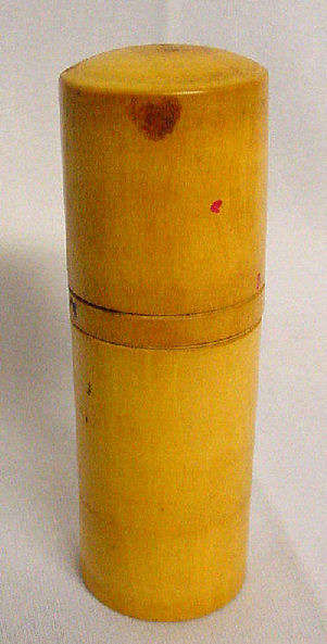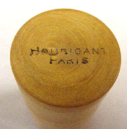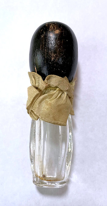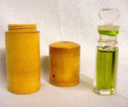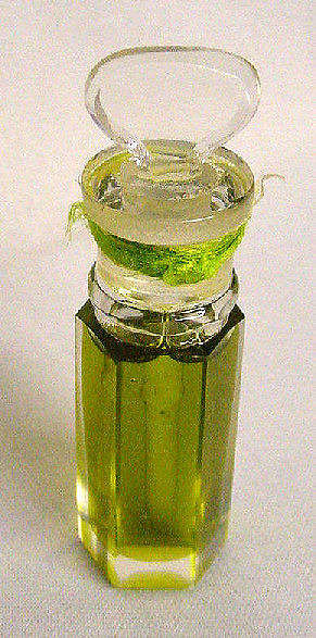This adorable little Houbigant perfume comes with its original bamboo case signed Houbigant, France, on the bottom. The lid unscrews to reveal a lovely little six-sided bottle with polished bottom. It has remnants of a green satin ribbon around the neck and original glass stopper which I am unable to remove. The contents may be a concentrated bath oil or perfume essence, I am not sure since I can't open it. I have never seen another like it! Immaculate condition and obviously unused. Bottle measures a bit over 5/8" diameter x almost 2-1/2" high. Case is 1" diameter x 3-1/8" high. Sure to be the most unique item in your collection! (Click on pic for more photos.) |