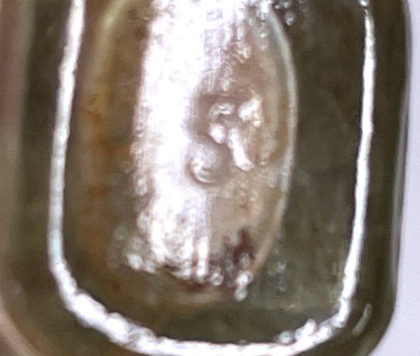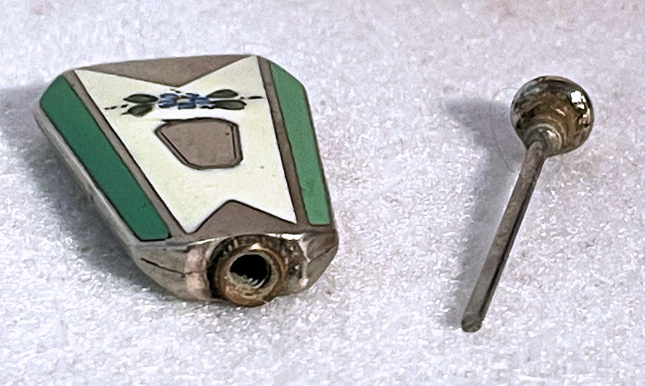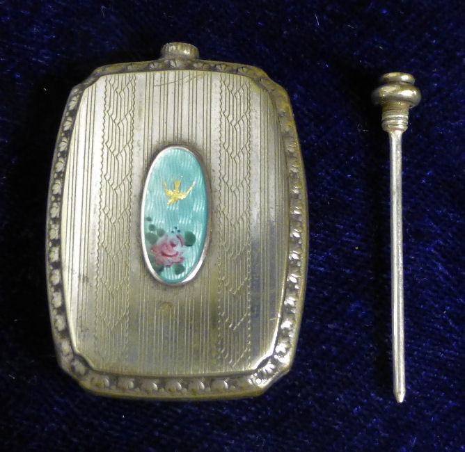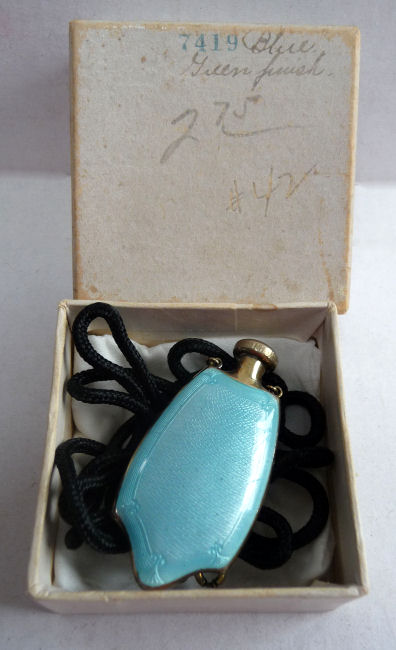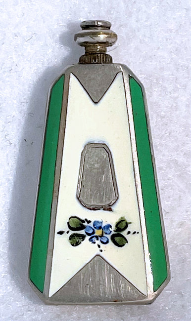 This is a lovely little Art Deco influenced petite purse perfume beautifully done in green and ivory enamel with a hand-painted blue forget-me-not on the front. There is a cartouche where a monogram couold be added if desired. The cap unscrews and has a long attached dauber. I believe it is sterling silver and the word STERLING was attempted to be stamped into the cap but all that can be made our are the vertical lines so I can't swear to it but I'm 99% sure it is. There are a few dark marks below the cartouche where enamel just missed but these are not chips as the surface is smooth so it is just the way it was made. Very cute and functional piece. Measures 1-5/8" long x 13/16" wide. (Click on pic for more photos.) |