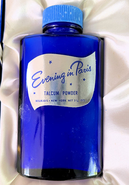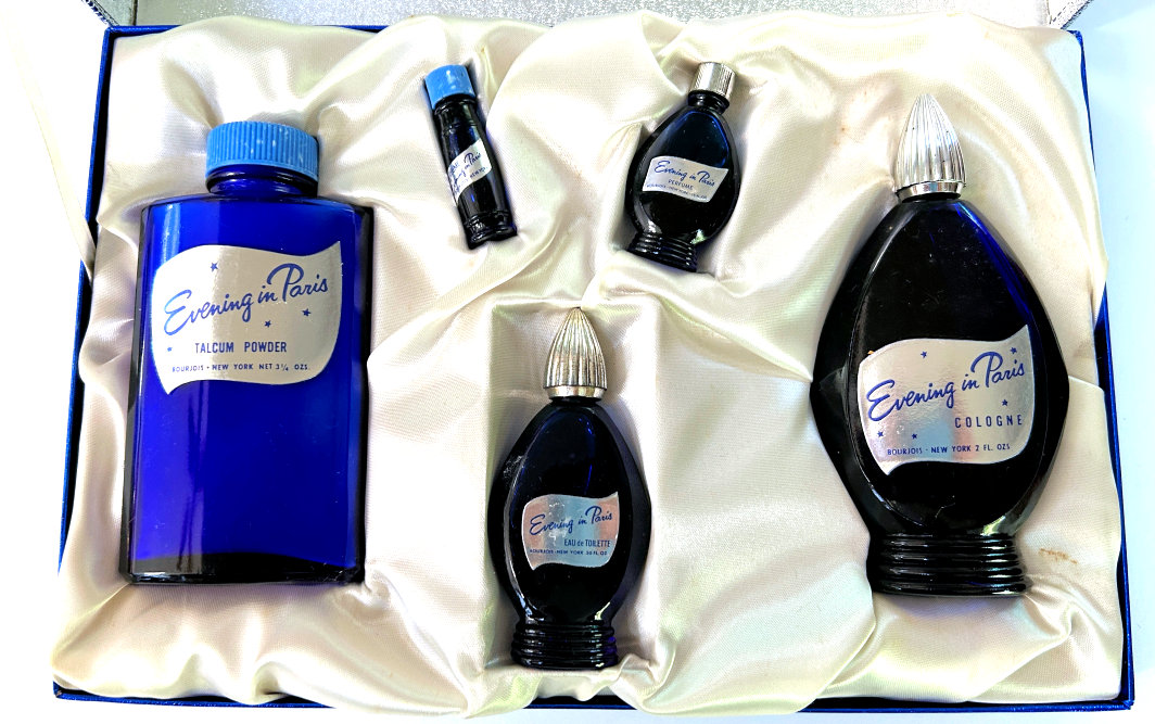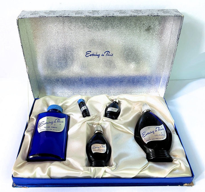 This is an absolutely gorgeous Evening in Paris gift set in its original iconic silver and blue foil presentation box. The set includes talcum powder, Eau de Toilette, Cologne, Perfume, and a purse-sized perfume. Please view all the close-ups for the quantities in each bottle. I have included pictures showing the amount of perfume/cologne remaining in the bottles. I don't believe these were ever used; I believe the contents have evaporated over time. I have seen this even with completely sealed perfumes and alcohols. Mystery to me how that happens LOL. Regardless, I consider this set to be like new and, if ever used, it was very minimal. Just a gorgeous set! The box measures 11-1/2" x 7-3/4" x 1-5/8" high. (Click on pic for more photos.) |