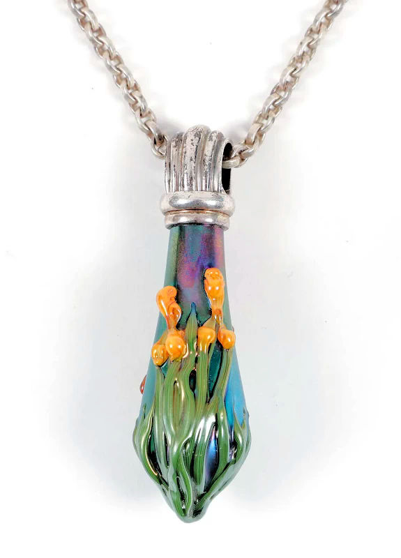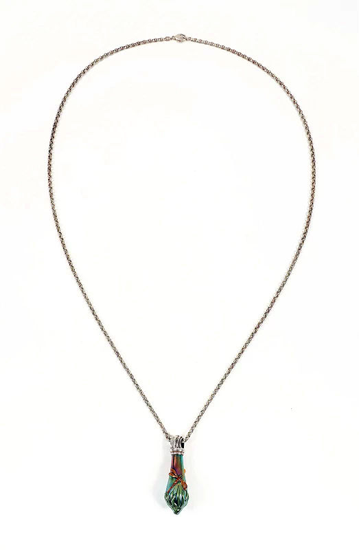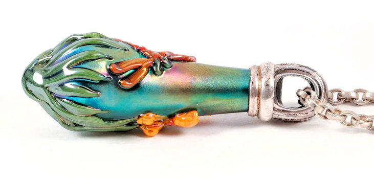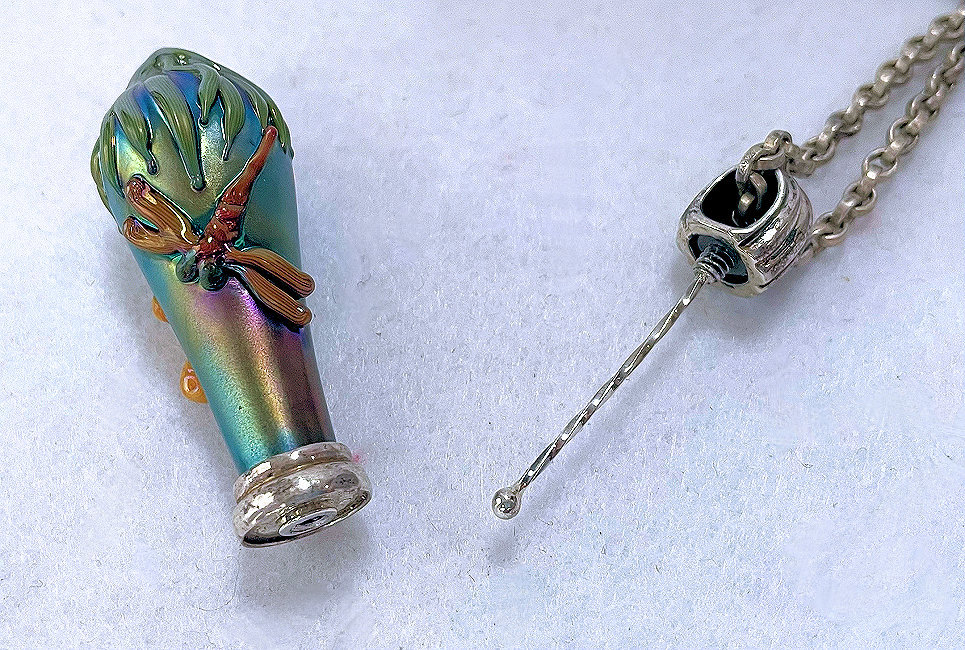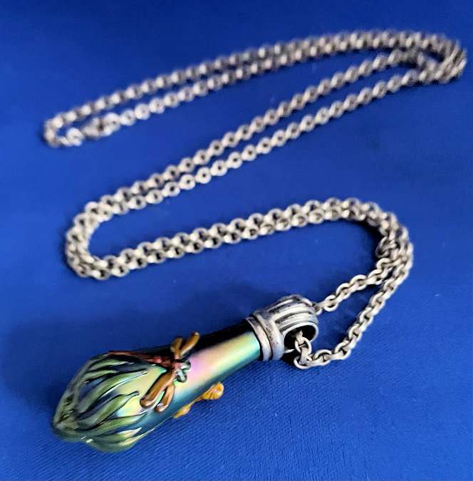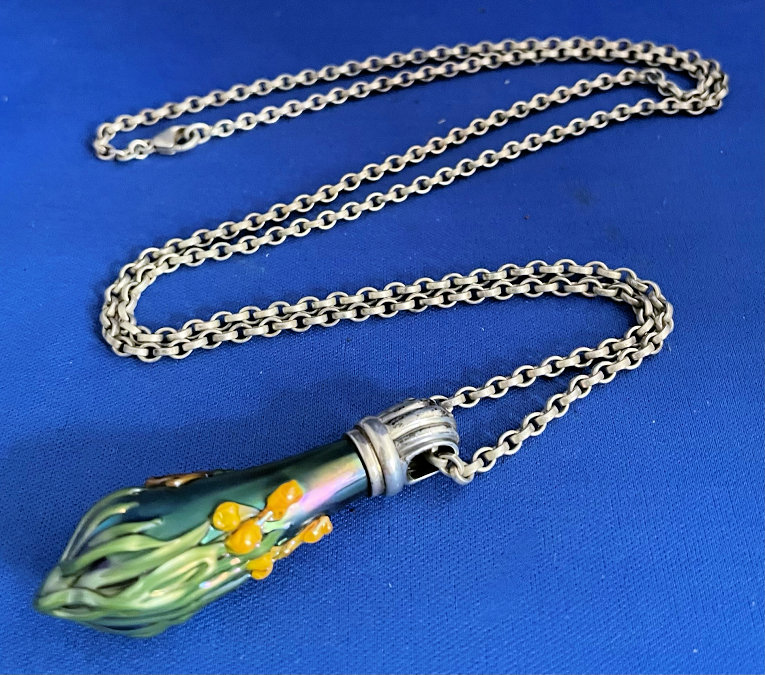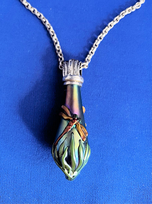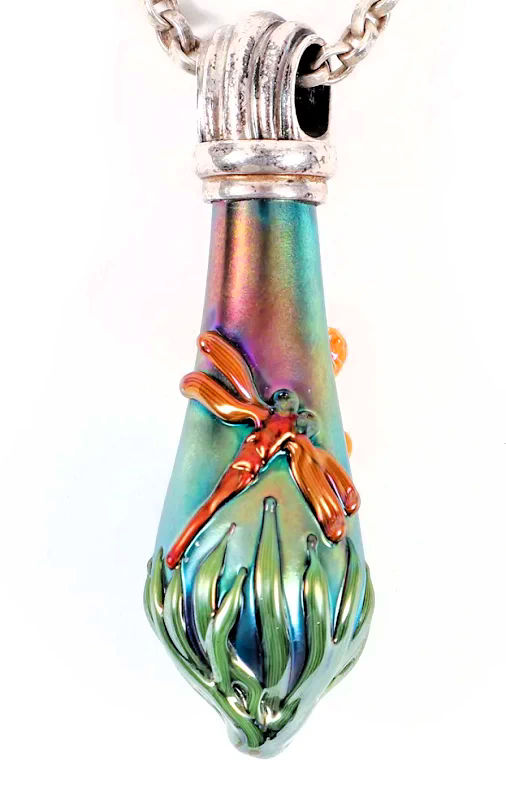 This beautiful figural art glass perfume bottle features a dragonfly on one side and yellow gladiolas on the other. The background is an iridescent purple and green on the top with color gradiating to teal blue at the bottom. The dragonfly, flowers and grass appear to be applied to the bottle. It is absolutely fantastic! The cap screws on and has a twisted silver dauber. The bottle top is signed "STER" for sterling and Roth Gilvey, presumably the artist who created it. It comes with a very substantial sterling silver chain which is also marked "925" for sterling. This has been a cherished part of my perfume collection and one I am reluctant to part with but I think I'm ready ;-). Bottle measures 2-1/2" from cap to tip. The silver chain measures 34" in length. It is in absolutely pristine condition. (Click on pic for more photos.) |